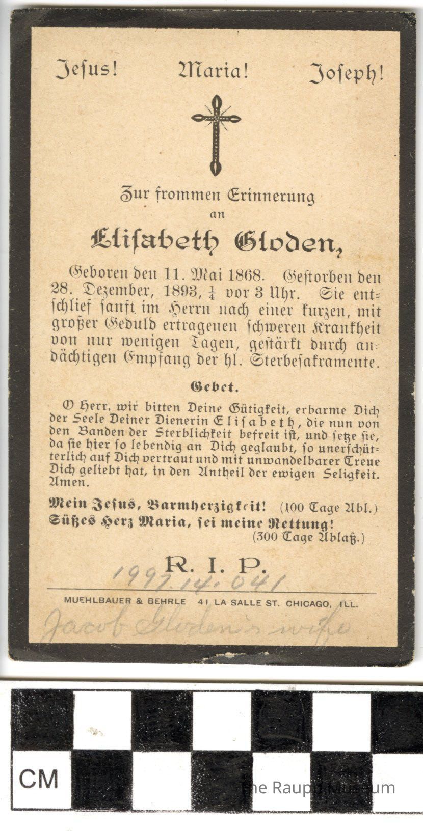 One (1) mourning prayer card for Elizabeth Gloden (born May 11th, 1868, died Dec. 28, 1893). On one side is a prayer in German. On the opposite side is a drawing of a cross, chalice, whip, branches, spear, sun. Drawing and text are in black ink.Archive Details