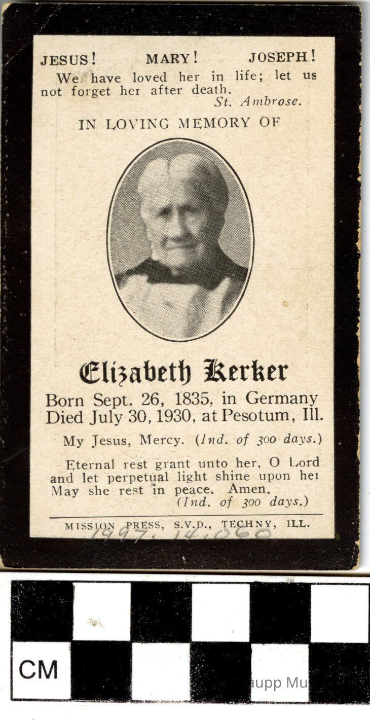 One (1) mourning prayer card for Elizabeth Theobald Kerker, born 9/26/1835, died 07/30/1930. On one side of the card is a prayer, scripture, and obituary in English with a printed portrait of Elizabeth. On the other side is a picture of the Virgin Mary praying with hands clasped and in white and black cloaks, with a biblical passage below.Archive Details