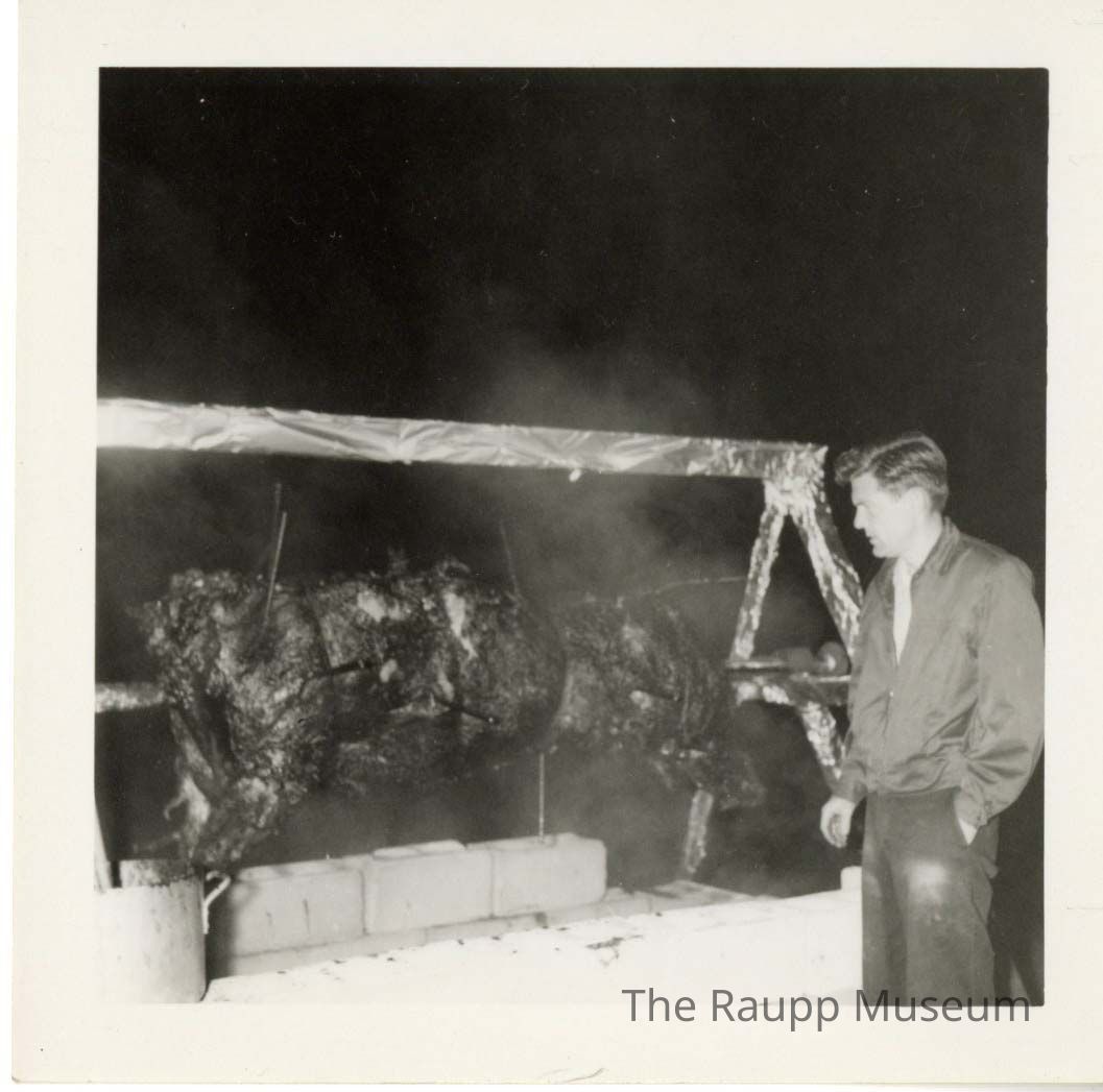 One (1) black and white photograph of a man at night looking at a steer roast. Steer roast was for the Emmerich Park dedication on 09/02/1963. Man is on the right in coat and pants, roast is cooking on left with wooden structure wrapped in tin foil. Man is Jim Stoltenberg. Back has handwritten: "Steer- Jim Stoltenberg, Emmerich Park Dedication. Sept. 2, 1963".Made/Created