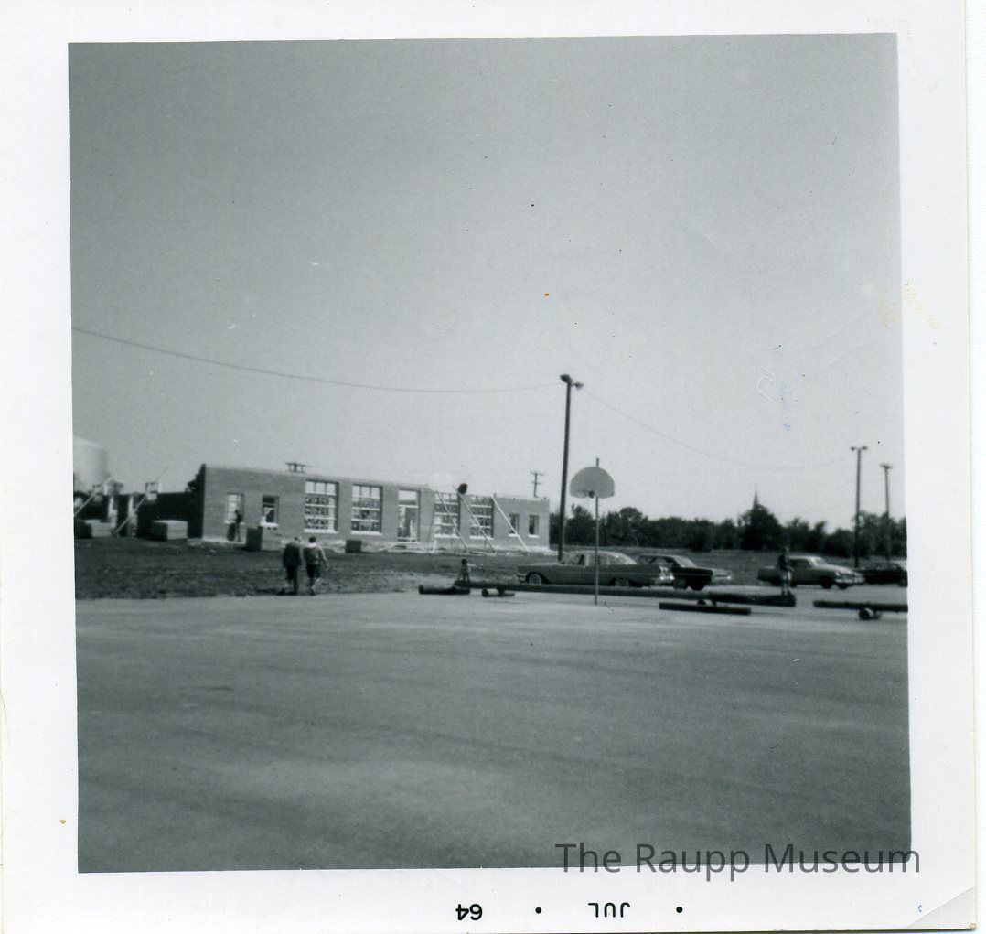 Black and white print with white border. Image of a partially built Emmerich Park building in the center of the photo with a parking lot in the foreground. reverse side pencil inscription: "laying pipe at Emmerich Park for sewer lines" and ink inscription: "Ruck; taken by Barb Ruck"Made/Created