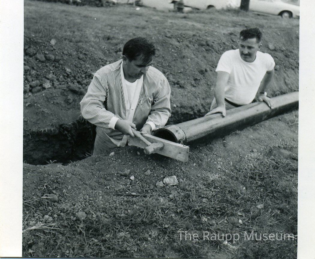 Black and white print with white border at left and right. Image of two men standing in a trench laying pipes at Emmerich Park. Reverse side pencil inscription: "Volunteers working on E.P. bldgs sewer lines" and blue pencil inscription: "P-5 #1 Handbook 100%." Black stamp in lower right corner "480."Made/Created