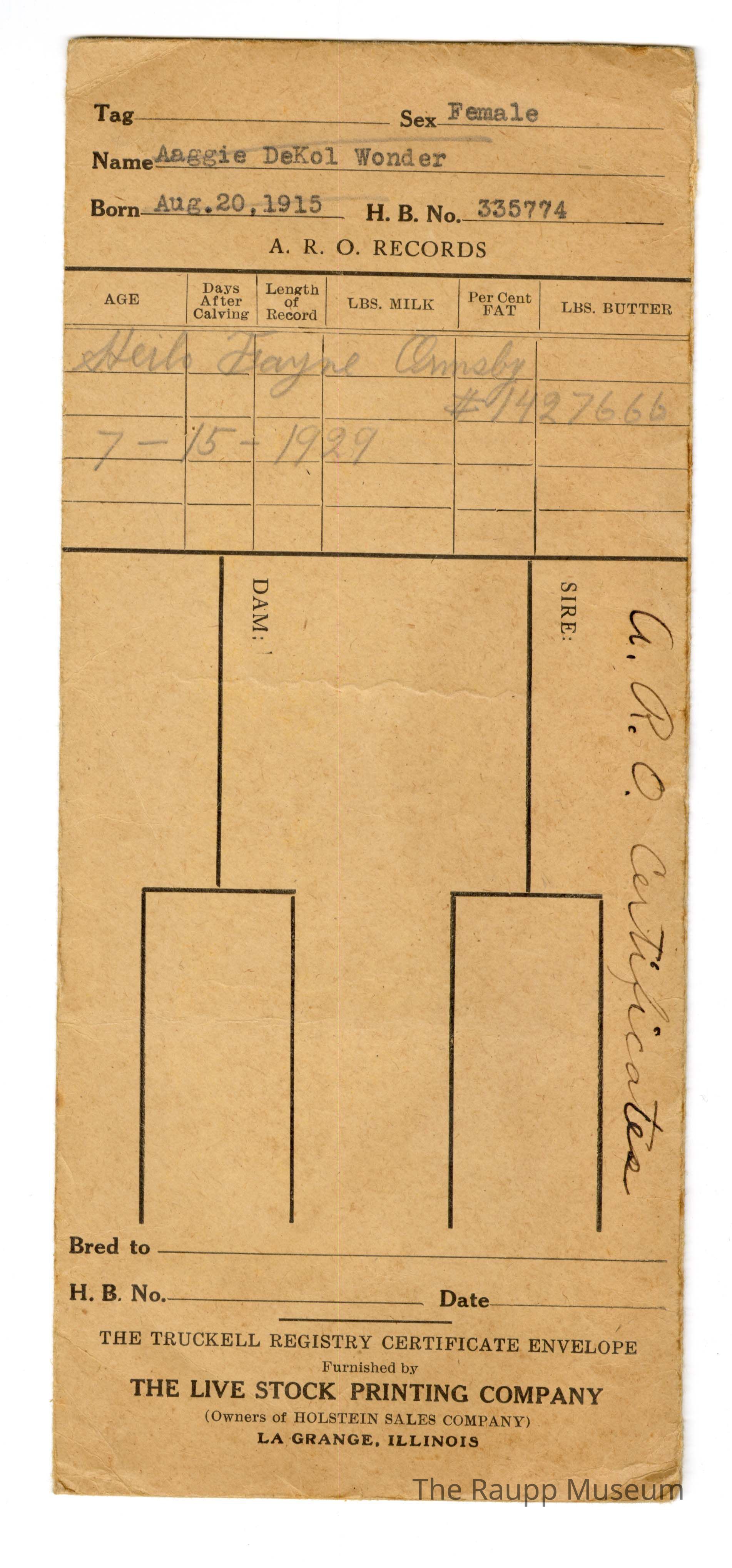 One (1) brown rectangular envelope for A.R.O Records (Advanced Registry). Typed into pre-printed spaces are Aaggie DeKol Wonder for August 20, 1915, H.B. No. 335774. Handwritten in pencil below the top is "Helio Fayne Ornmsby #1427666, 7-15-1929". Envelope held ARO certificates for Nickol Family Farm.