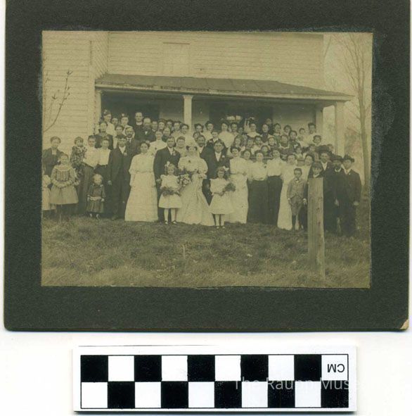 Matte photographic print mounted to a gray card. Image is matte, with yellow and brown colors. Contains image of Theodore Weidner and Anna Schmidt on their wedding day standing in front of the exterior of a house with several rows of family. reverse side has inscription text: "On left: Mary Raupp holding Frank in plaid dress; Theo Weidner's wedding."Relationships