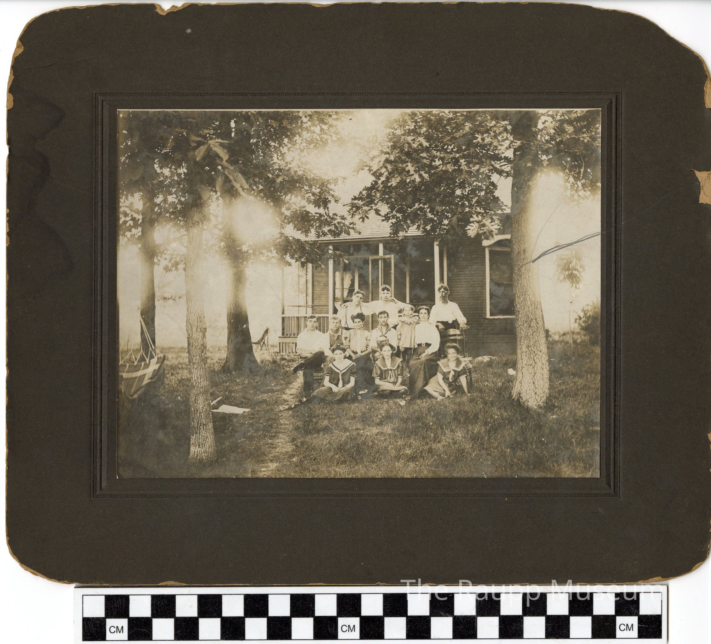 One (1) black and white photograph attached to a dark mat board. Photo has a small house with porch and trees around it. There is a hammock on the left and folding chair in background on left. In front of the house is a family: Three women seated in grass in front row, three men, two women, and one young girl seated in middle row, three young men standing in back row. Screened in porch door in open. No identifying information found with photo.