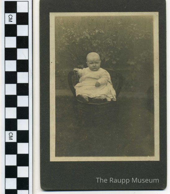 Black and white print with white border mounted to a gray mat card. Image of a child seated outdoors in a chair and wearing a white long-sleeved dress. With a plant behind the chair. reverse side has pencil inscription: Ferdinand E Connerly age 6 months; taken in Momma and Pappa yard; from Etta and John."Relationships