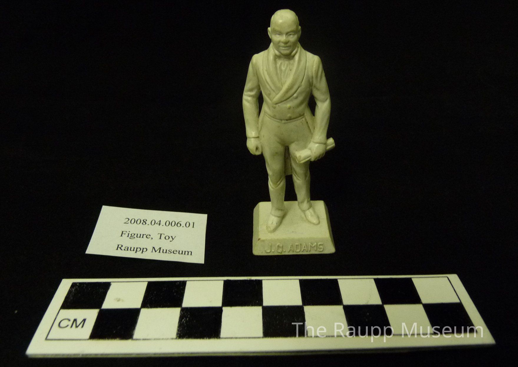 One (1) white plastic figurine of John Quincy Adams. He is wearing a double breasted jacket with tails, long pants and dress shoes. He is holding a scroll in his left hand. On the front of the base it reads "J.Q. Adams" and on the back of the base it reads "6th. 1825-29". This object is directly labeled on th bottomDimensions