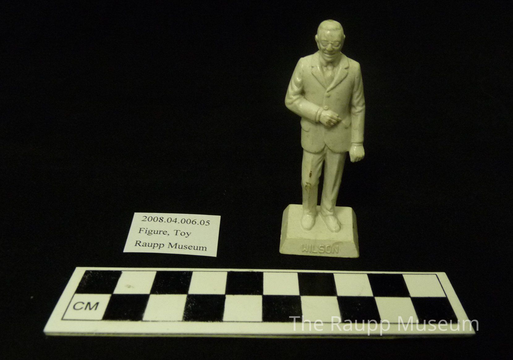 One (1) white plastic figurine of Woodrow Wilson. He is wearing a suit, long pants and dress shoes. His right hand is placed across his stomach. On the front of the base it reads "Wilson" and on the back of the base it reads "28th 1913-21". This object is directly labeled on the bottomDimensions