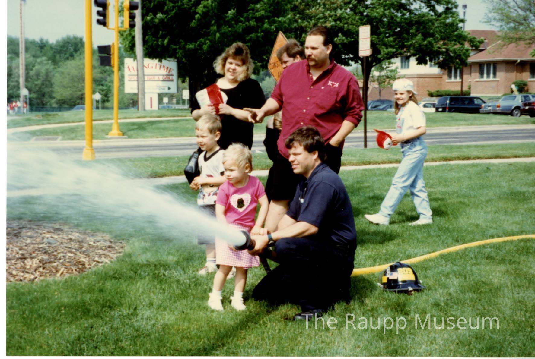 One (1) color photo of a fire fighter on his knees in the grass, holding a fire hose with a toddler in pink. 3 other adults and 2 children watch as water shoots out. They are near an intersection.Made/Created