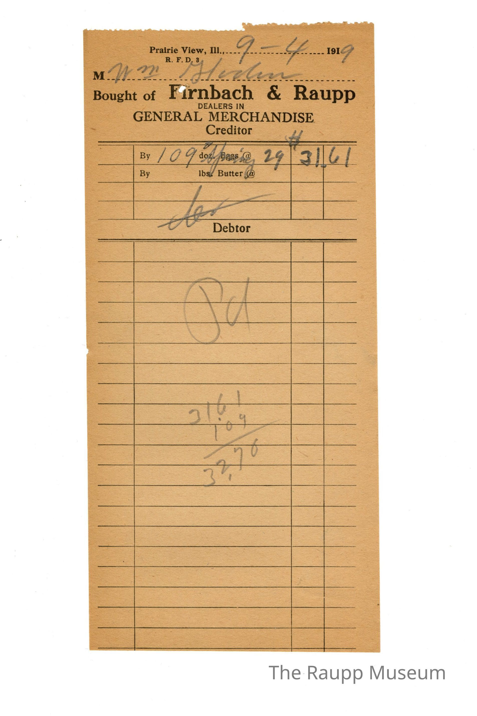 One (1) Firnbach and Raupp store receipt from September 04, 1919. Receipt recipient is William (written to Wm. on the receipt) Gloden and has zero (0) items purchased. Wm. Gloden brought in one hundred nine (109) dozen eggs for twenty nine cents ($0.29) each which resulted in a credit of thirty one dollars and sixty one cents ($29.29) for the eggs and an additional one dollar and nine cents ($1.09) for an unknown resaon. Wm. Gloden was paid thirty dollars and seventy cents ($32.70). Receipt is rectangular, has black ink lines and written in pencil. The top reads: Bought of; Firnbach and Raupp; DEALERS IN; GENERAL MERCHANDISE (printed in capital letters); Creditor, Debtor. There is one addition equation on the back of the page.Archive Details