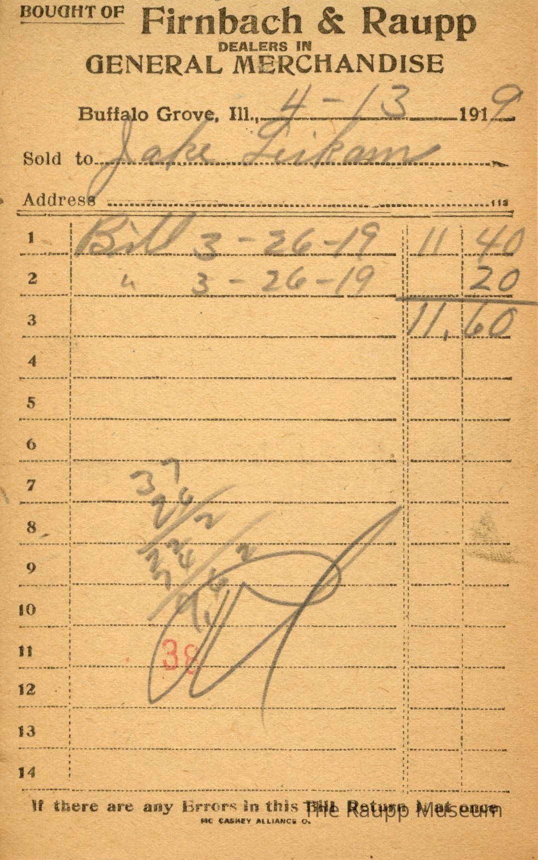 The black text is as follows, from top to bottom: Bought of Firnbach & Raupp; Dealers in GENERAL MERCHANDISE; Buffalo Grove, Ill.; Sold to; Address; If there are any Errors in this Bill Return it at once; MC CASKEY ALLIANCE O.Archive Details