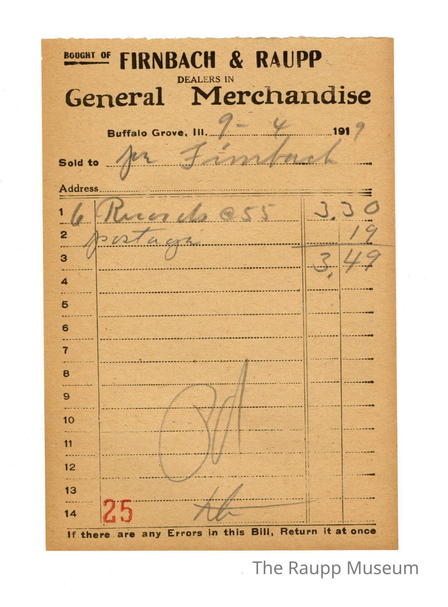 One (1) Firnbach and Raupp store receipt from September 04, 1919. Receipt recipient is Joe Firnbach and has two (2) items purchased (six (6) Records @ 55 and one (1) postage. Joe Firnbach paid three dollars and forty nine cents ($3.49). Receipt is rectangular, has blue ink lines and written in pencil. The top reads: BOUGHT OF (printed in capital letters and underlined); Firnbach and Raupp; DEALERS IN; GENERAL MERCHANDISE (printed in capital letters); Buffalo Grove, Ill; Sold to; Address. The bottom reads: If there are any Errors in this Bill Return it at once. The number twenty five (stamped as 25) is stamped in the bottom left of the page in red ink.Archive Details