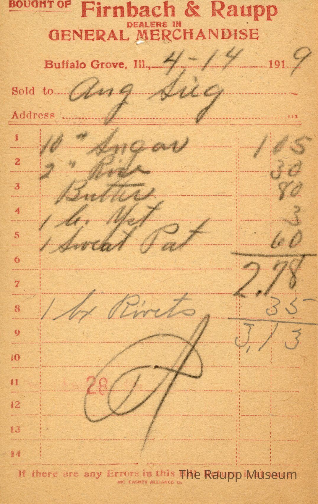 One (1) Firnbach and Raupp store receipt from April 14, 1919. Receipt is rectangular with red printed text and written notes in pencil. The receipt is for August Sieg, who bought ten pounds of sugar for $1.05, two pounds of rice for $0.30, butter for $0.80, one (measurement of?) yeast for $0.03, one sweat pat (?) for $0.60, and one box of rivets for $0.35. Bill total is $3.13. There's a red stamp of 28 close to the bottom, with the bill marked as paid.