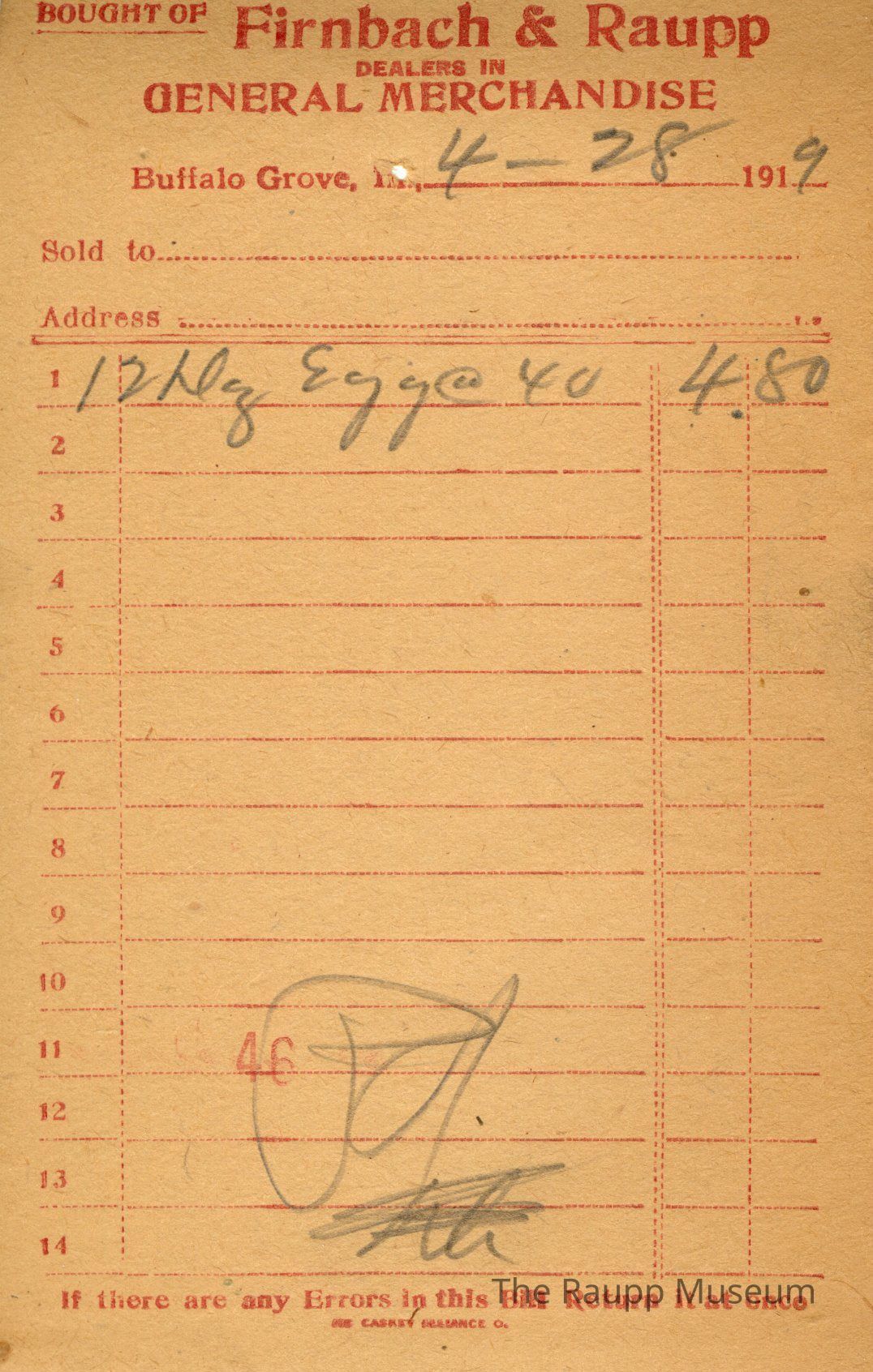 One (1) Firnbach and Raupp store receipt from April 28, 1919. Receipt is rectangular with red printed text and written notes in pencil. The receipt is for an unknown customer, who bought twelve dozens of eggs at the unit price of $0.40 per dozen. Bill total is $4.80. There's a red stamp of 46 close to the bottom, with the bill marked as paid.