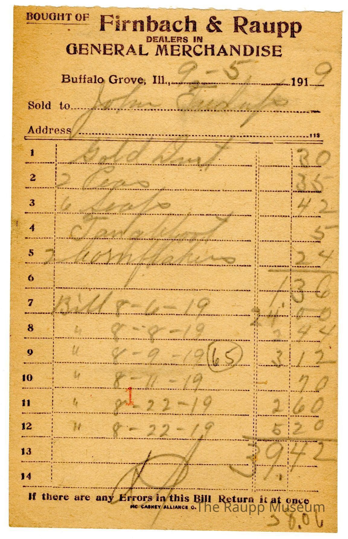 One (1) Firnbach and Raupp store receipt from September 05, 1919. Receipt recipient is John Tundup and has eleven (11) items purchased (one (1) Gold Dust, two (2) Peas, six (6) soap, one (1) unknown item, two (2) cornflakes, one (1) Bill from August 6, 1919 (written as 8-6-19), one (1) Bill from August 8, 1919 (written as 8-8-19), one (1) Bill from August 9, 1919 (written as 8-9-19), one (1) Bill from August 11, 1919 (written as 8-11-19, one (1) Bill from August 22, 1919 (written as 8-22-19), and one (1) Bill from August 22, 1919 (written as 8-22-19)). John Tundup paid thirty nine dollars and forty two cents ($39.42). Receipt is rectangular, has black ink and written pencil. The top reads: Prairie View, Ill; BOUGHT OF (underlined and printed in capital letters); Firnbach & Raupp; DEALERS IN; GENERAL MERCHANDISE (printed in capital letters); Buffalo Grove Ill; Sold to; Address. The bottom reads: If there are any Errors in this Bill Return it at once. The number one (stamped as 1) is stamped in red ink at the bottom center of the page.Archive Details