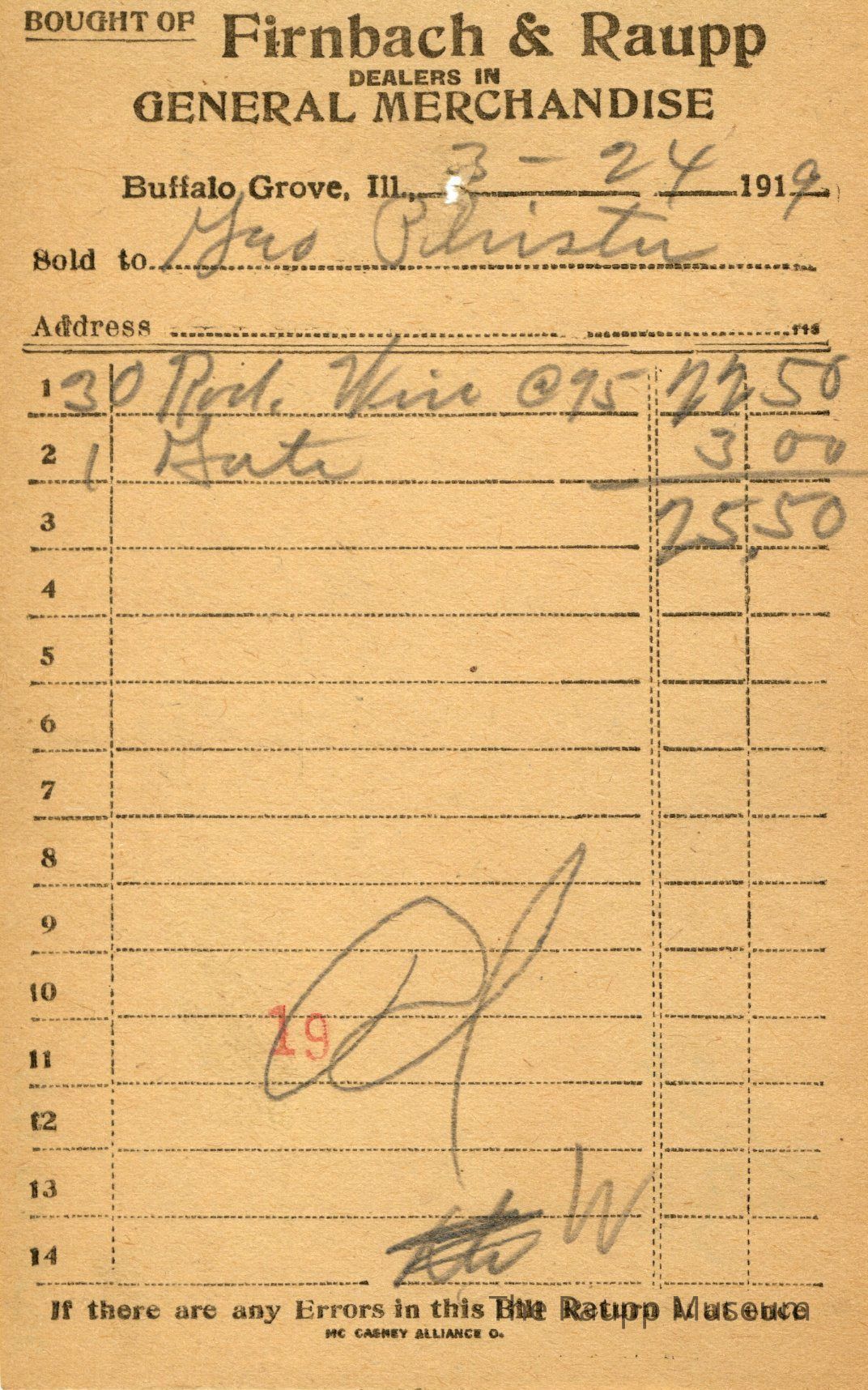 The black text is as follows, from top to bottom: Bought of Firnbach & Raupp; Dealers in GENERAL MERCHANDISE; Buffalo Grove, Ill.; Sold to; Address; If there are any Errors in this Bill Return it at once; MC CASKEY ALLIANCE O.Archive Details