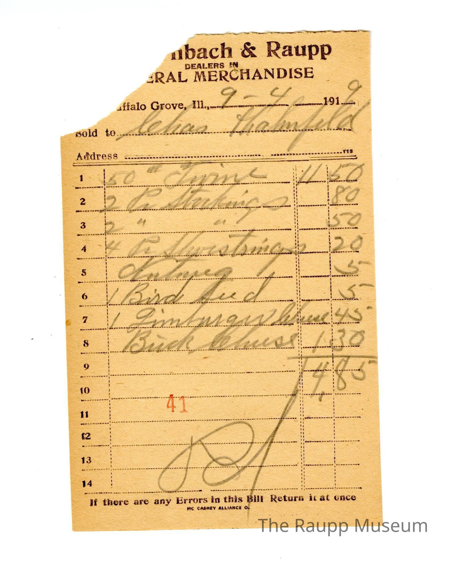 One (1) Firnbach and Raupp store receipt from September 04, 1919. Receipt recipient is Charles (written as Chas) Hahnfeld and has eight (8) items purchased (fifty (50) inches twine, two (2) packs (written as Pk) stockings, two (2) packs (writtens as Pk) stockings, four (4) pack (written as Pk) shoe strings , one (1) Nutmeg, one (1) Bird Seed, one (1) Limburger cheese, and one (1) Brick Cheese. Chas Hahnfeld paid four dollars and eighty five cents ($4.85). Receipt is rectangular, has black ink and written in pencil. The top reads: BOUGHT OF (written in capital letters and underlined); Firnbach and Raupp; DEALERS IN; GENERAL MERCHANDISE (printed in capital letters); Buffalo Grove Ill.,; Sold to; Address. The bottom reads: If there are any Errors in this Bill Return it at once. Reciept is rectangular, has black ink and written in pencil.Archive Details