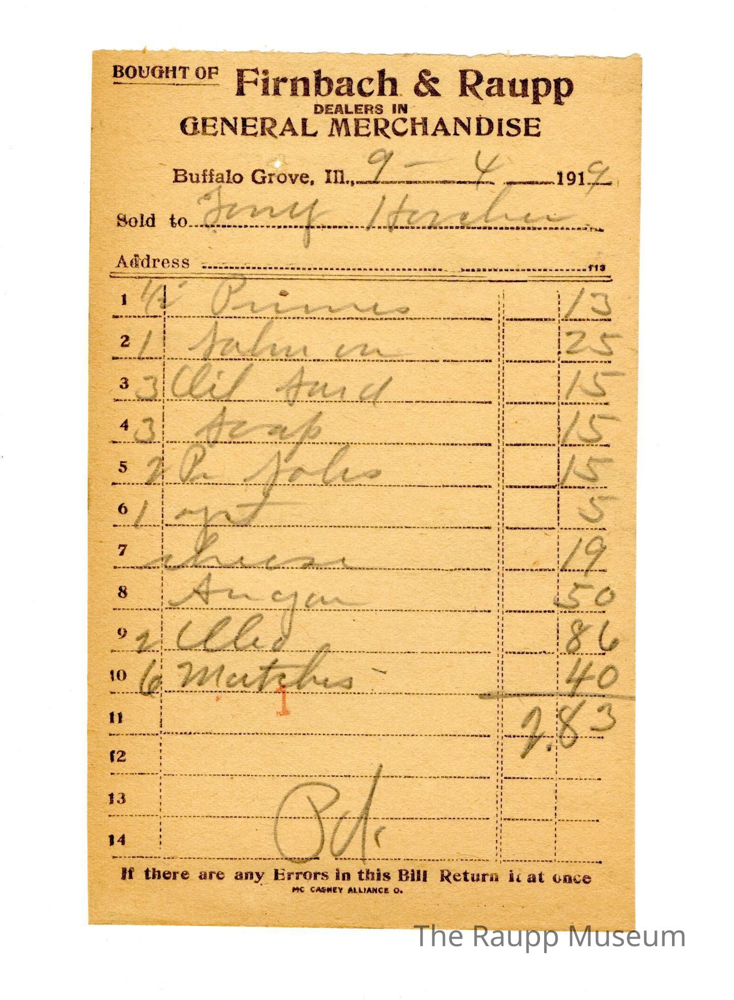 One (1) Firnbach and Raupp store receipt from September 04, 1919. Receipt recipient is Tony Horcher and has ten (10) items purchased (one half (1/2) prunes one (1) salmon three (3) oil sard, three (3) soap, two (2) pack (written as Pk) unknown item, one (1) yeast, one (1) cheese, one (1) sugar, two (1) olio, and six (6) matches. Tony Horcher paid two dollars and eighty three cents ($2.83). Reciept is rectangular, has black ink and written in pencil. The top reads: BOUGHT OF (written in capital letters and underlined); Firnbach and Raupp; DEALERS IN; GENERAL MERCHANDISE (printed in capital letters); Buffalo Grove Ill.,; Sold to; Address. The bottom reads: If there are any Errors in this Bill Return it at once. Receipt is rectangular, has black ink and written in pencil. The top reads: BOUGHT OF (written in capital letters and underlined); Firnbach and Raupp; DEALERS IN; GENERAL MERCHANDISE (printed in capital letters); Buffalo Grove Ill.,; Sold to; Address. The bottom reads: If there are any Errors in this Bill Return it at once. The number one (stamped as 1) is stamped in red in the bottom center of the page.Archive Details