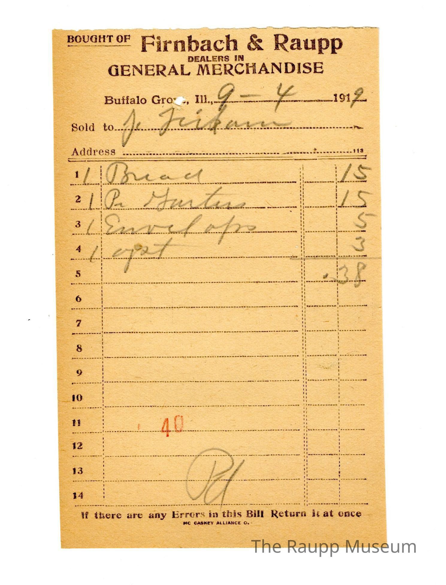 One (1) Firnbach and Raupp store receipt from September 04, 1919. Receipt recipient is J. Leikam and has four (4) items purchased (one (1) bread, one pair (written as Pr) garters, one (1) Envelopes, one (1) oyster (written as oyst)). J. Leikam paid thirty eight cents ($0.38). Receipt is rectangular, has black ink and written in pencil. The top reads: BOUGHT OF (printed in capital letters and underlined); Bought of Firnbach and Raupp; DEALERS IN; GENERAL MERCHANDISE (printed in capital letters); Buffalo Grove, Ill.; Sold to; Address. The bottom reads: If there are any Errors in this Bill Return it at once. The number forty (stamped as 40) is stamped in red in the lower center of the receiptArchive Details