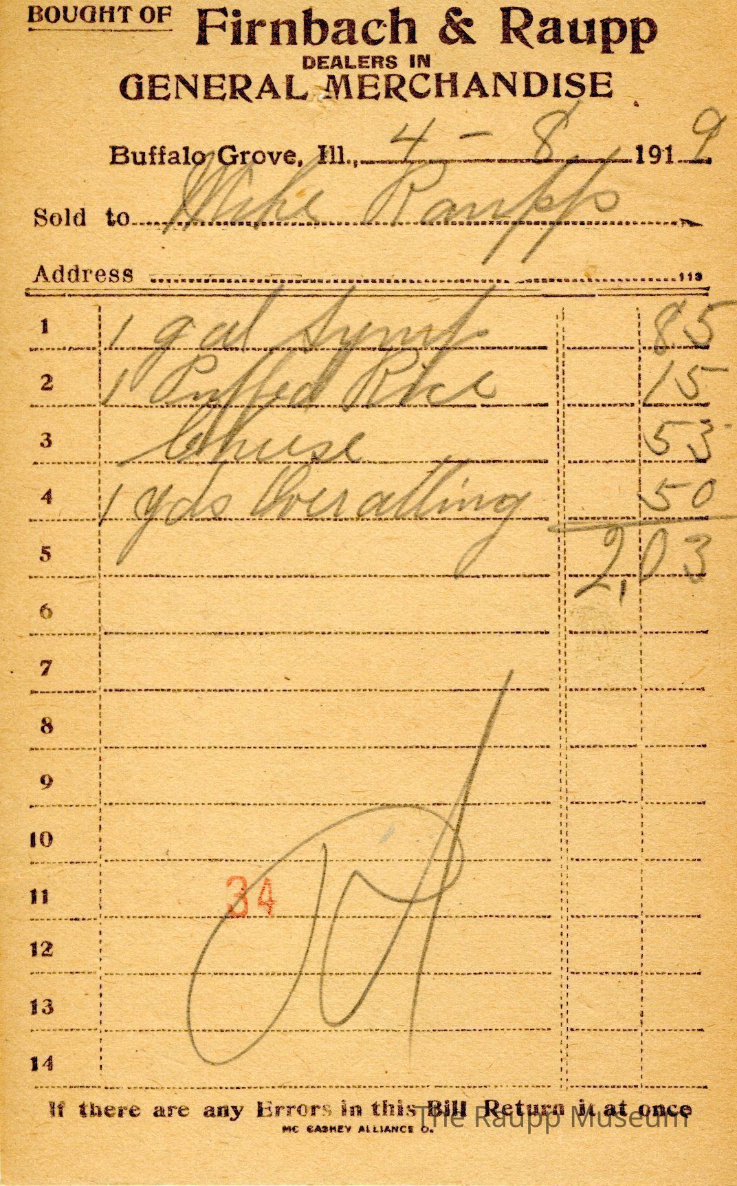One (1) Firnbach and Raupp store receipt from April 8, 1919. Receipt is rectangular with black printed text and written notes in pencil. The receipt is for Mike Raupp, who bought one gallon of syrup for $0.85, one (package of?) puffed rice for $0.15, cheese for $0.53, and one yards of overalling for $0.50. Bill total is $2.03. There's a red stamp of 34 close to the bottom, with the bill marked as paid.