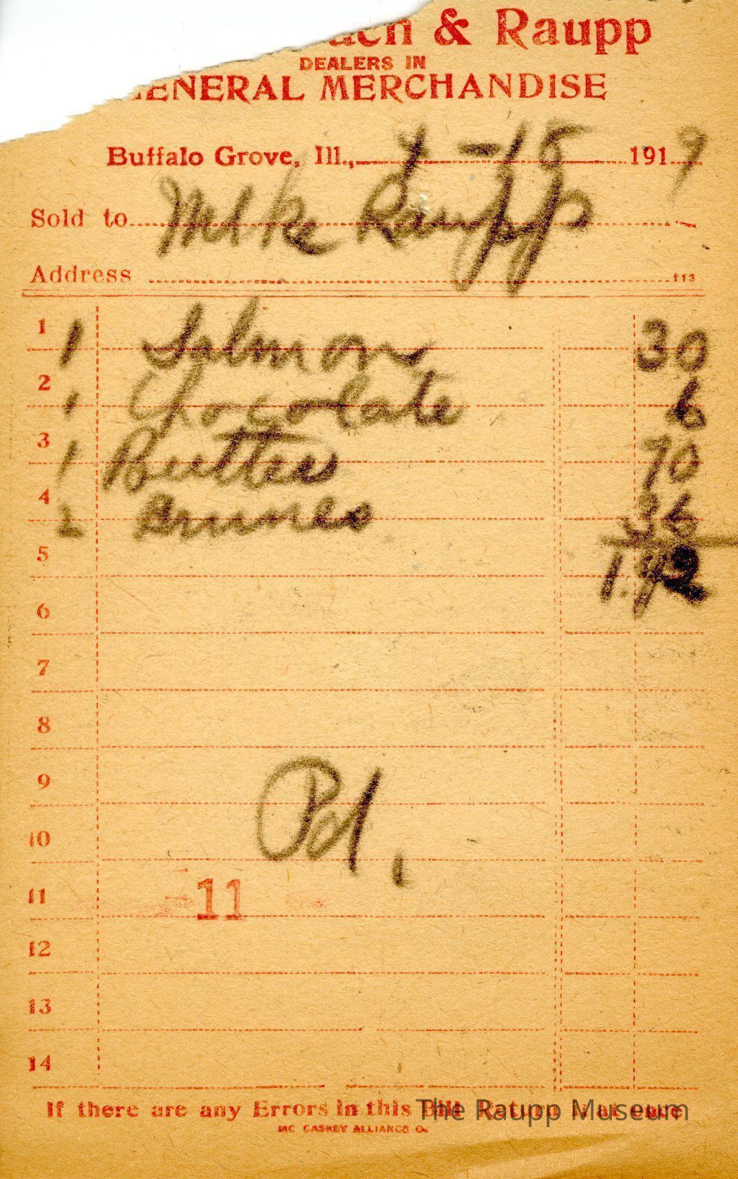 The red text is as follows, from top to bottom: Bought of Firnbach & Raupp; Dealers in GENERAL MERCHANDISE; Buffalo Grove, Ill.; Sold to; Address; If there are any Errors in this Bill Return it at once; MC CASKEY ALLIANCE O.Archive Details