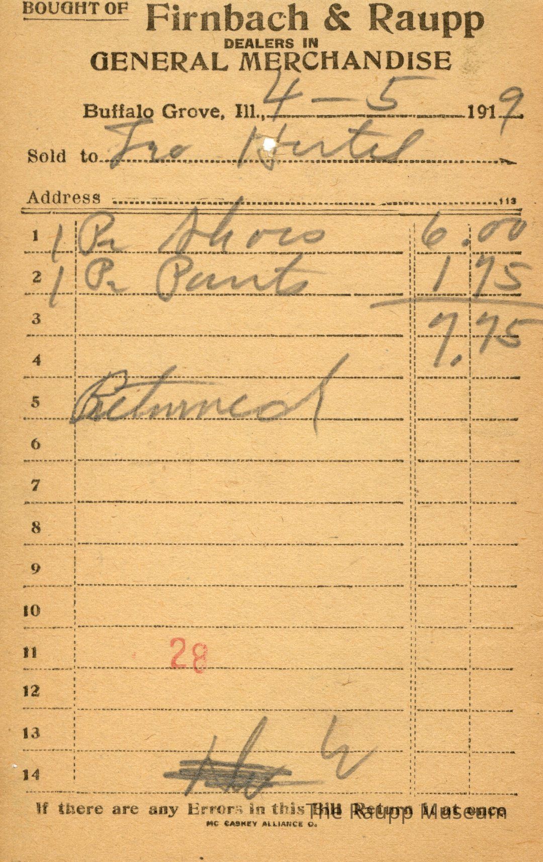 One (1) Firnbach and Raupp store receipt from April 5, 1919. Receipt is rectangular with black printed text and written notes in pencil. The receipt is for George Hertel, who bought one pair of shoes for $6 and one pair of pants for $1.75. Bill total is $7.75. There's a red stamp of 28 close to the bottom, with the bill marked as returned (see line 5).
