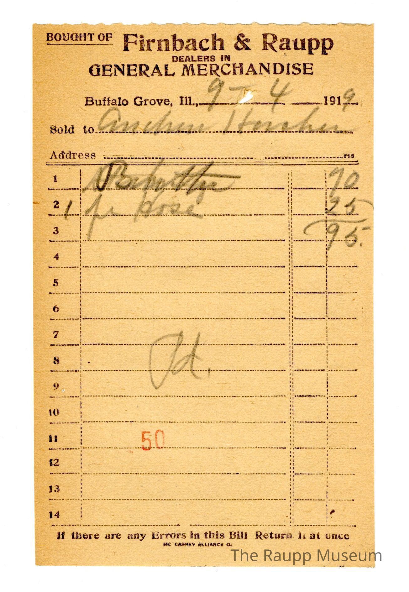 One (1) Firnbach and Raupp store receipt from September 04, 1919. Receipt recipient is Andrew Horcher and has two (2) items purchased (two (2) butter (prediction based on writting), and one (1) unknown hose (abbreviated word written is unknown). Andrew Horcher paid ninety five cents ($0.95). Receipt is rectangular, has black ink and written in pencil. The top reads: BOUGHT OF (printed in capital letters and underlined); Firnbach and Raupp; DEALERS IN; GENERAL MERCHANDISE (printed in capital letters); Buffalo Grove, Ill.; Sold to; Address. The bottom reads: If there are any Errors in this Bill Return it at once. The number fifty (stamped as 50) is stamped in red ink in the lower middle of the receipt.Archive Details
