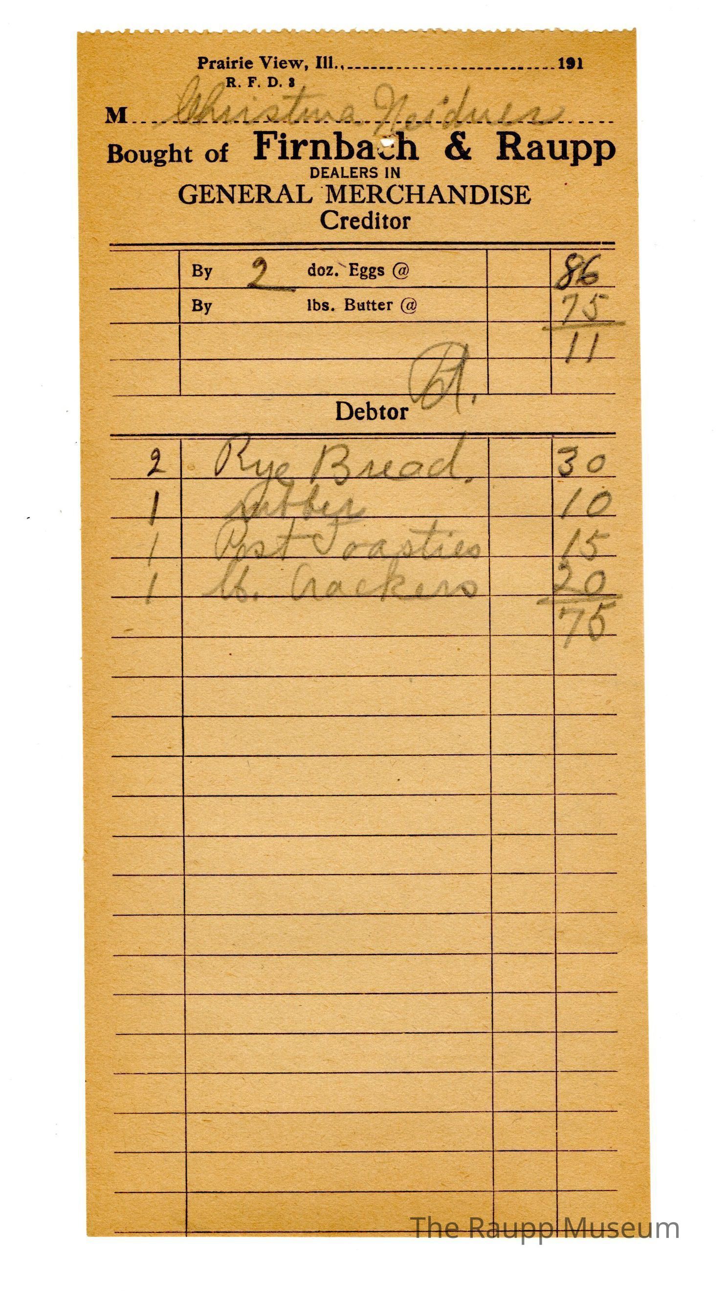 One (1) Firnbach and Raupp store receipt from September 04, 1919. Receipt recipient is Christina Weidner and has four (4) items purchased (two (2) rye bread, one (1) muffin, one (1) Post Toasties, and one (1) pound (written as lbs) crackers). Christina Weidner's bill was seventy five cents ($0.75) however Christina Weidner brought in two (2) dozen eggs earning a credit of eighty six cents ($0.86). Christina Weidner paid eleven cents ($0.11). Receipt is rectangular, has black ink and written in pencil. The top reads: Prairie View, Ill; R.F.D.3; Bought of Firnbach and Raupp; DEALERS IN; GENERAL MERCHANDISE (printed in capital letters); Creditor; Debtor.Archive Details