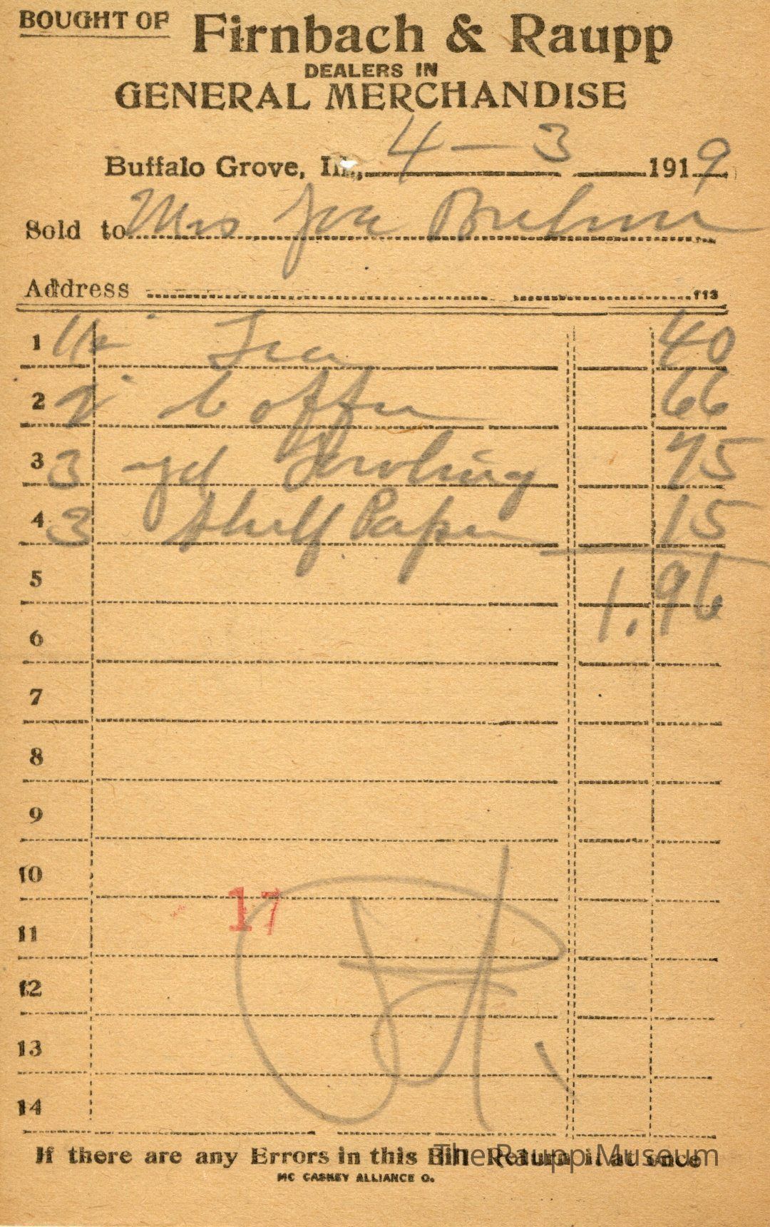 The black text is as follows, from top to bottom: Bought of Firnbach & Raupp; Dealers in GENERAL MERCHANDISE; Buffalo Grove, Ill.; Sold to; Address; If there are any Errors in this Bill Return it at once; MC CASKEY ALLIANCE O.Archive Details