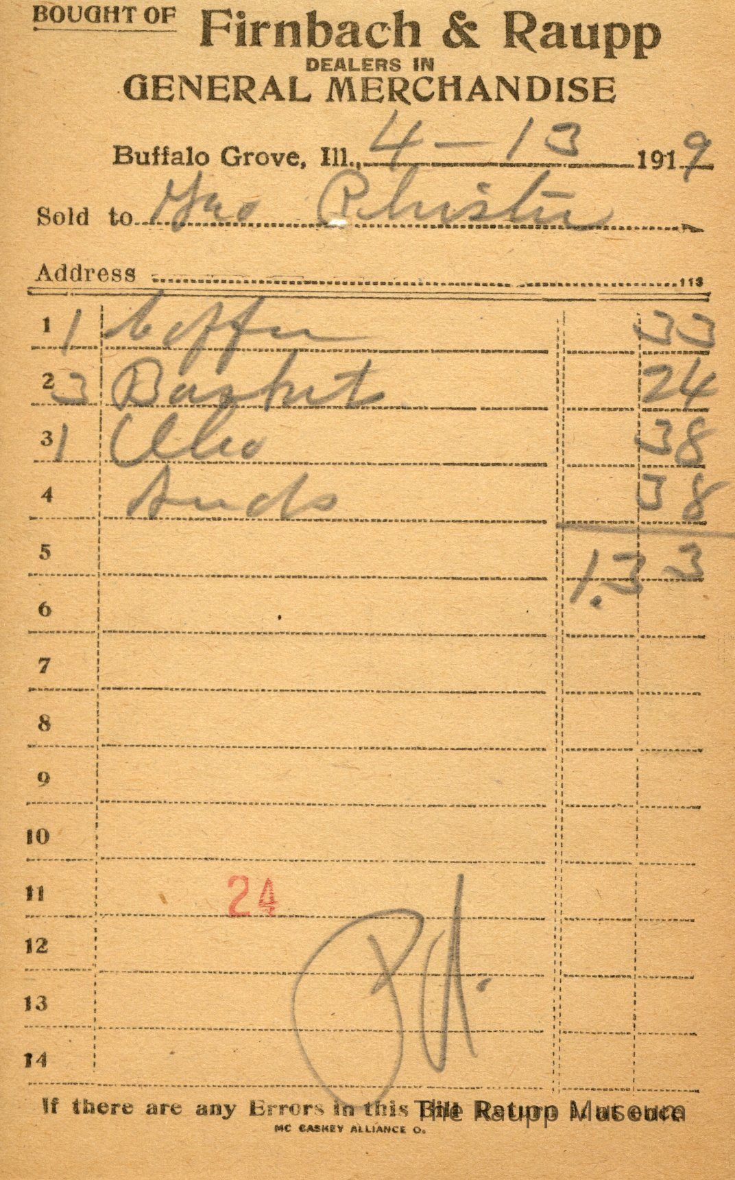 The black text is as follows, from top to bottom: Bought of Firnbach & Raupp; Dealers in GENERAL MERCHANDISE; Buffalo Grove, Ill.; Sold to; Address; If there are any Errors in this Bill Return it at once; MC CASKEY ALLIANCE O.Archive Details