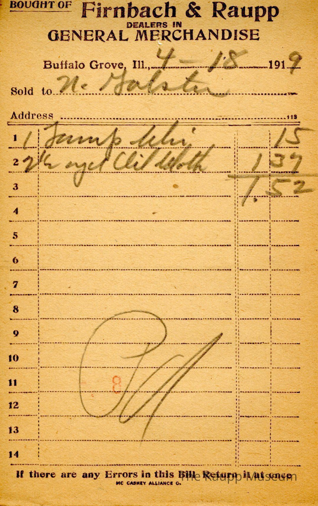The black text is as follows, from top to bottom: Bought of Firnbach & Raupp; Dealers in GENERAL MERCHANDISE; Buffalo Grove, Ill.; Sold to; Address; If there are any Errors in this Bill Return it at once; MC CASKEY ALLIANCE O.Archive Details