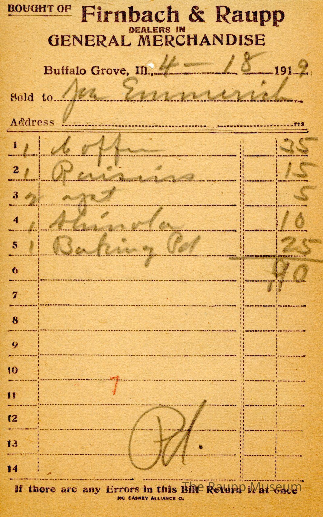 The black text is as follows, from top to bottom: Bought of Firnbach & Raupp; Dealers in GENERAL MERCHANDISE; Buffalo Grove, Ill.; Sold to; Address; If there are any Errors in this Bill Return it at once; MC CASKEY ALLIANCE O.Archive Details
