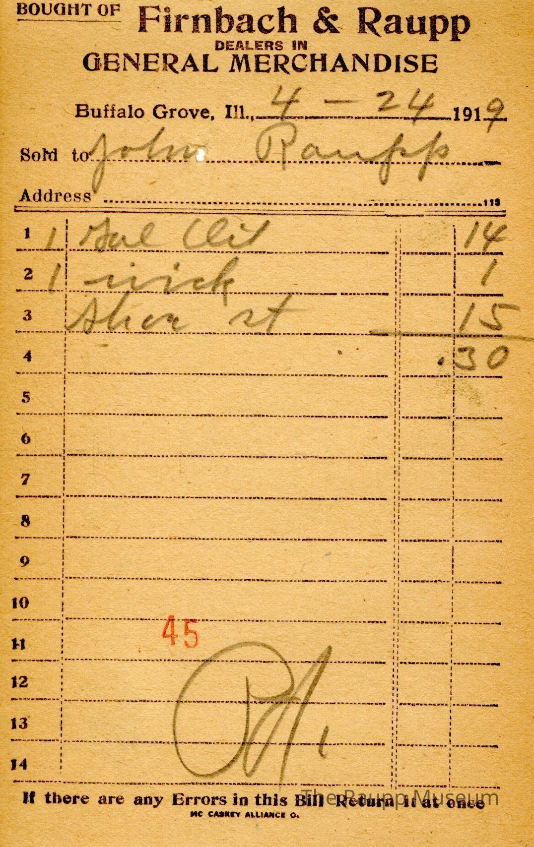 The black text is as follows, from top to bottom: Bought of Firnbach & Raupp; Dealers in GENERAL MERCHANDISE; Buffalo Grove, Ill.; Sold to; Address; If there are any Errors in this Bill Return it at once; MC CASKEY ALLIANCE O.Archive Details