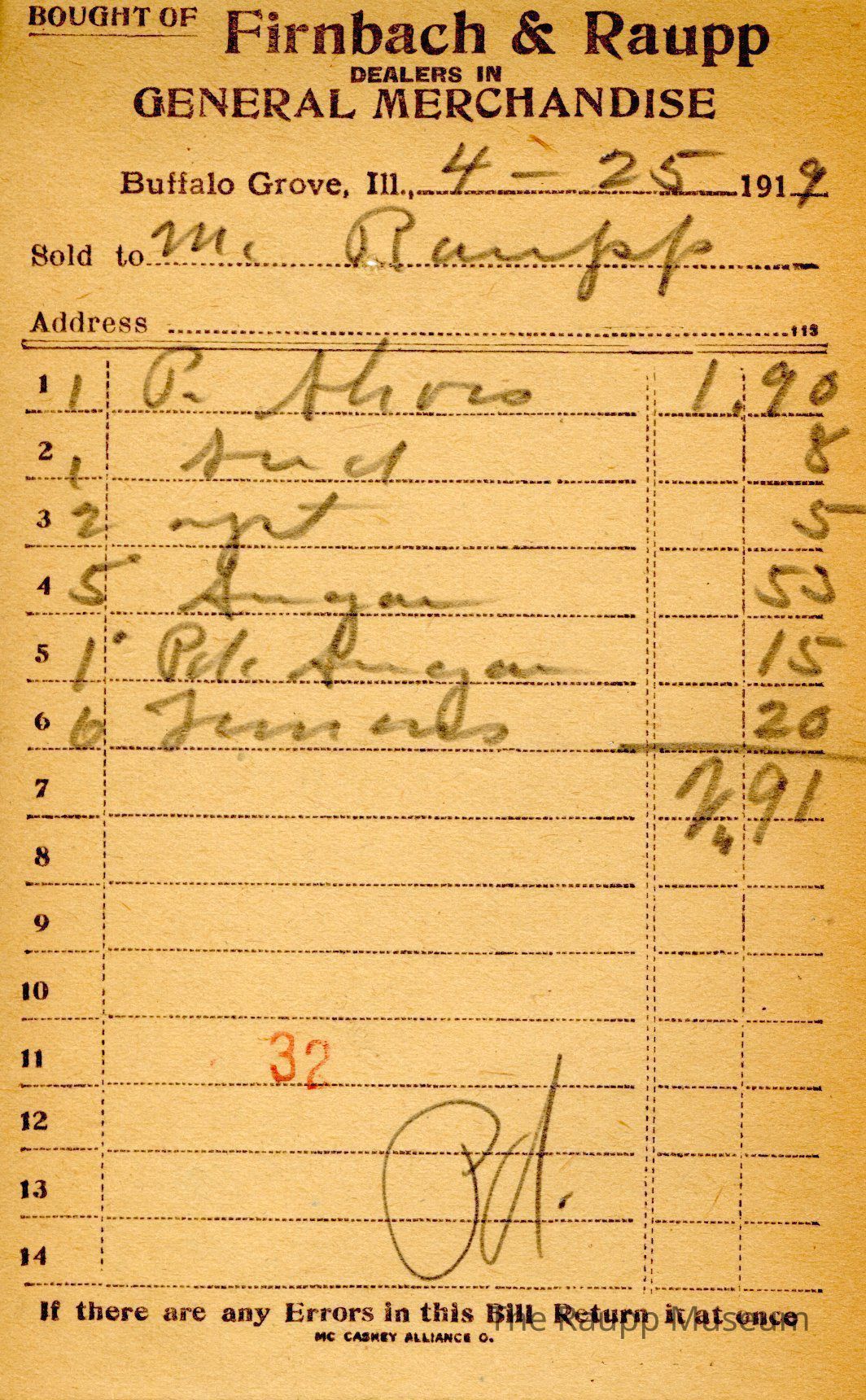 The black text is as follows, from top to bottom: Bought of Firnbach & Raupp; Dealers in GENERAL MERCHANDISE; Buffalo Grove, Ill.; Sold to; Address; If there are any Errors in this Bill Return it at once; MC CASKEY ALLIANCE O.Archive Details