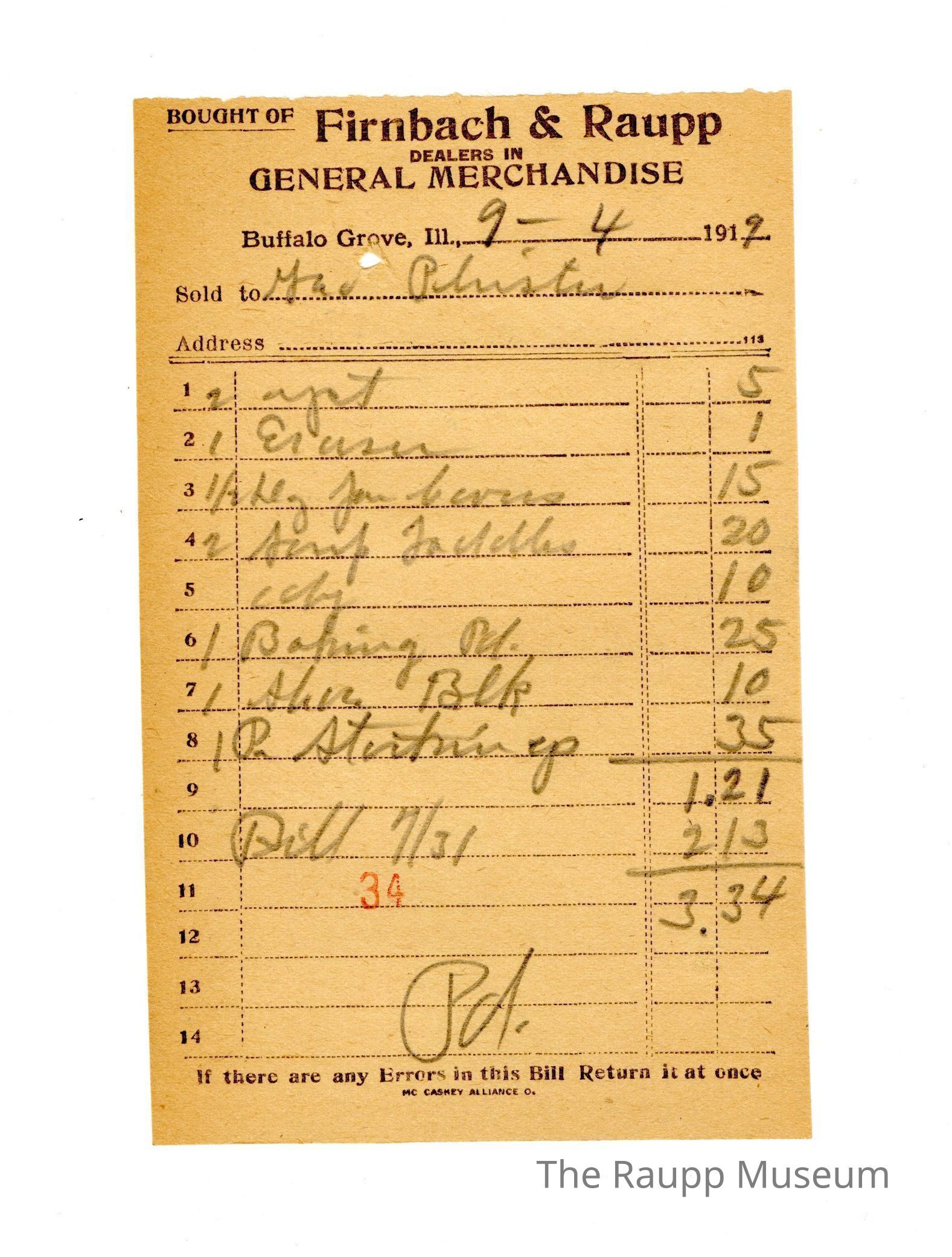 One (1) Firnbach and Raupp store receipt from September 04, 1919. Receipt recipient is Geo Phister and has nine (9) items purchased (one (1) yeast (written as yst), one (1) eraser, one (1) one half (1/2) dozen (written as dz) jar covers, one (1) unknown item, one (1) baking powder (written ad Baking Pd.), one (1) Shoe Block (written Shoe Blk), one (1) pair stockings, one (1) bill from July 31,1919 (written as Bill 7/31)). Geo Phister paid three dollars and thirty four cents ($3.34). Receipt is rectangular, has black ink and written in pencil. The top reads: BOUGHT OF (printed in capital letters and underlined); Firnbach and Raupp; DEALERS IN; GENERAL MERCHANDISE (printed in capital letters); Buffalo Grove, Ill.; Sold to; Address. The bottom reads: If there are any Errors in this Bill Return it at once. The number thirty four (stamped as 34) is stamped in red ink in the lower middle of the receipt.Archive Details
