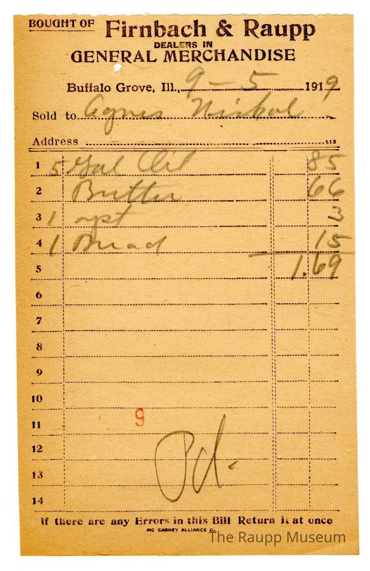 One (1) Firnbach and Raupp store receipt from September 05, 1919. Receipt recipient is Agnes Nichol and has four (4) items purchased (five (5) gallon (written as gal) olio, one (1) butter, one (1) yeast (yst) and one (1) bread). Ang Seig paid one dollar and sixty nine cents ($1.69). Receipt is rectangular, has black ink and written pencil. The top reads: Prairie View, Ill; BOUGHT OF (underlined and printed in capital letters); Firnbach & Raupp; DEALERS IN; GENERAL MERCHANDISE (printed in capital letters); Buffalo Grove Ill; Sold to; Address. The bottom reads: If there are any Errors in this Bill Return it at once. The number nine (stamped as 9) is stamped in red ink at the bottom center of the page.Archive Details