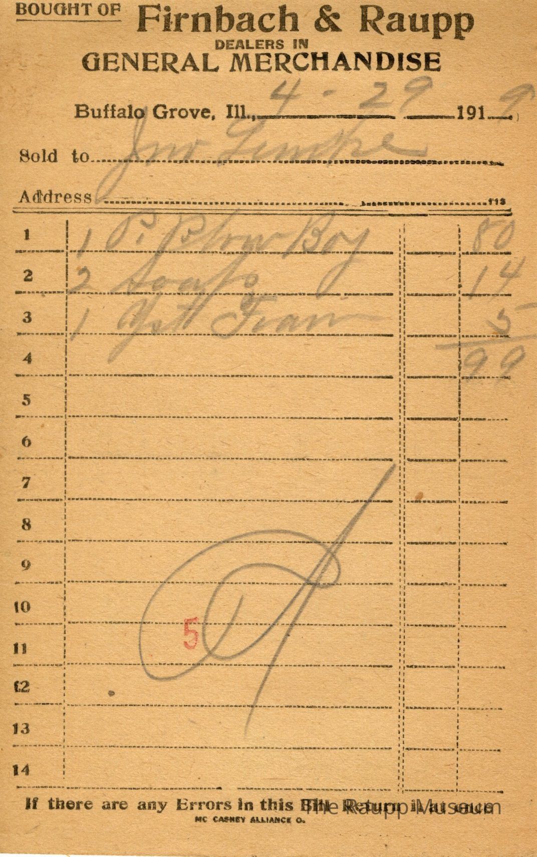 The black text is as follows, from top to bottom: Bought of Firnbach & Raupp; Dealers in GENERAL MERCHANDISE; Buffalo Grove, Ill.; Sold to; Address; If there are any Errors in this Bill Return it at once; MC CASKEY ALLIANCE O.Archive Details