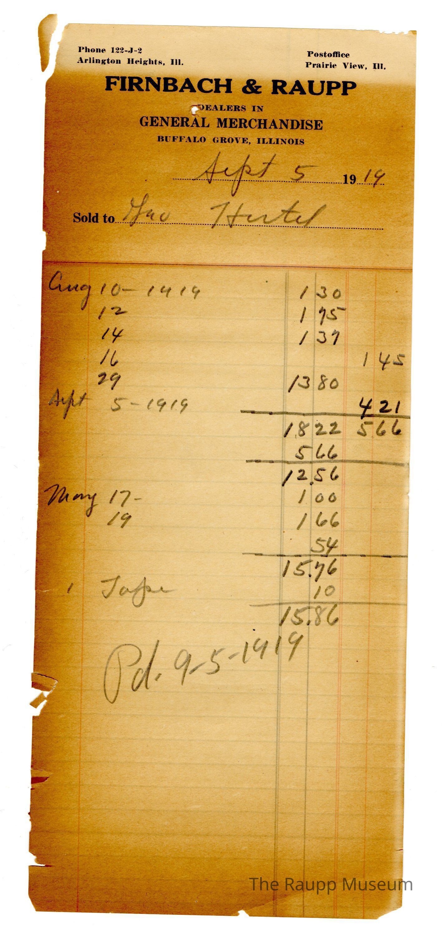 One (1) Firnbach and Raupp store receipt from September 05, 1919. Receipt recipient is Geo Hertel and has ten (10) items purchased (one (1) Bill from August 10, 1919, one (1) Bill from August 12, 1919, one (1) Bill from August 14, 1919, one (1) Bill from August 16, 1919, one (1) Bill from August 29, 1919, one (1) Bill from September 5, 1919, one (1) Bill from May 17, 1919, one (1) Bill from May 19, 1919, and one (1) tape. Geo Hertel paid fifteen dollars and eighty six cents ($15.86). Receipt is rectangular, has black, red & blue ink and written pencil. The top right corner reads: Phone 122-J-2; Arlington Heights, Ill. The top left reads: Postoffice; Prairie View, Ill. The top center reads: FIRNBACH & RAUPP; DEALERS IN GENERAL MERCHANDISE; BUFFALO GROVE, ILLINOIS (printed in capital letters); Sold to.Archive Details