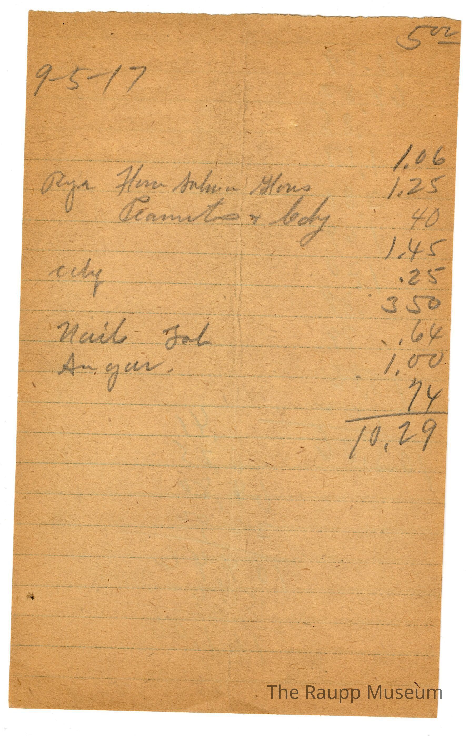 One (1) Firnbach and Raupp store receipt from September 05, 1919. Receipt recipient is unknown and has ten (10) items purchased (one (1) rye (best prediction based on writing), one (1) Ham (best prediction based on writing), one (1) salmon, one (1) unknown item + one (1) unknown item, one (1) unkown item, one (1) Nails Job, and one (1) Sugar. Unknown paid ten dollars and twenty nine cents ($1.50). Receipt is rectangular, has blue ink and written pencil. On the back of the receipt two addition equations is written in pencil.Archive Details