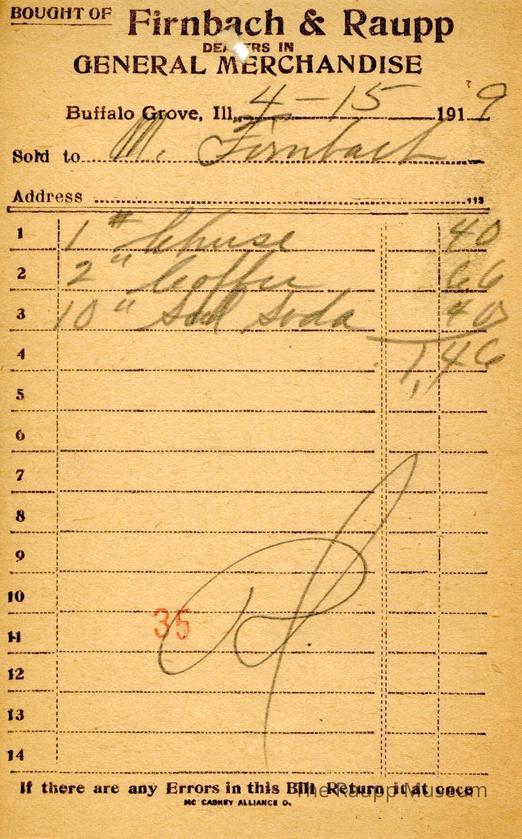 One (1) Firnbach and Raupp store receipt from April 15, 1919. Receipt is rectangular with black printed text and written notes in pencil. The receipt is for M. Firnbach, who bought one pound of cheese for $0.40, two pounds of coffee for $0.66, and ten pounds of sal soda for $0.40. Bill total is $1.46. There's a red stamp of 35 close to the bottom, with the bill marked as paid.
