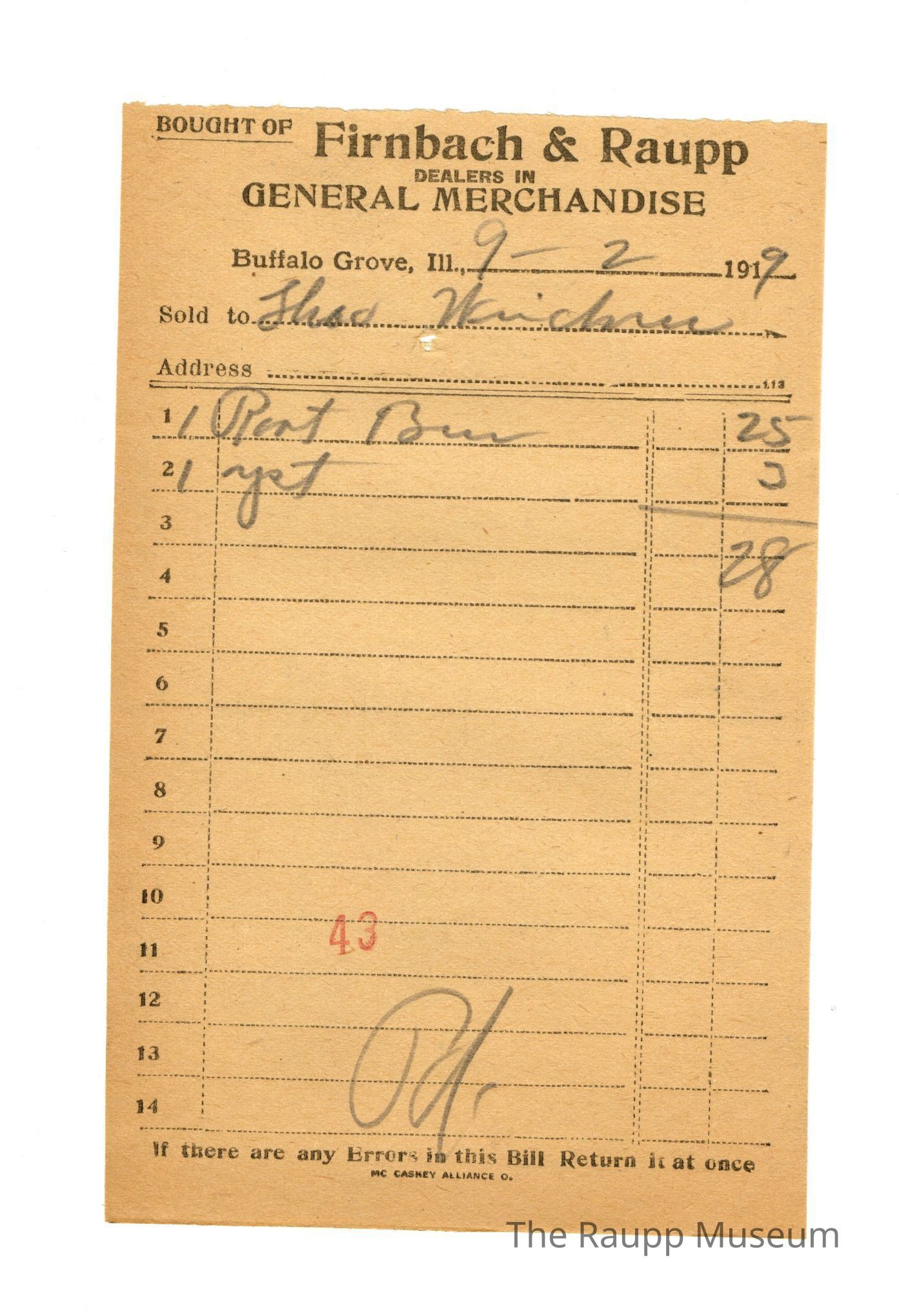 One (1) Firnbach and Raupp store receipt from September 02, 1919. Receipt recipient is Theodore (written as Theo on the reciept) Weidner, and has two (2) items purchased (one (1) root beer and one (1) yeast (written as yst)). Theo Weidner paid twenty eight cents ($0.28). Receipt is rectangular, with black printed ink, and written in pencil. The top reads: Bought of Firnbach & Raupp; DEALERS IN GENERAL MERCHANDISE (printed in all capital letters); Buffalo Grove, Ill,: Sold to; Address. The bottom reads: If there are any Errors in this Bill Return it at once. The number forty three (stamped 43) is stamped in red in the bottom middle of the page.Archive Details