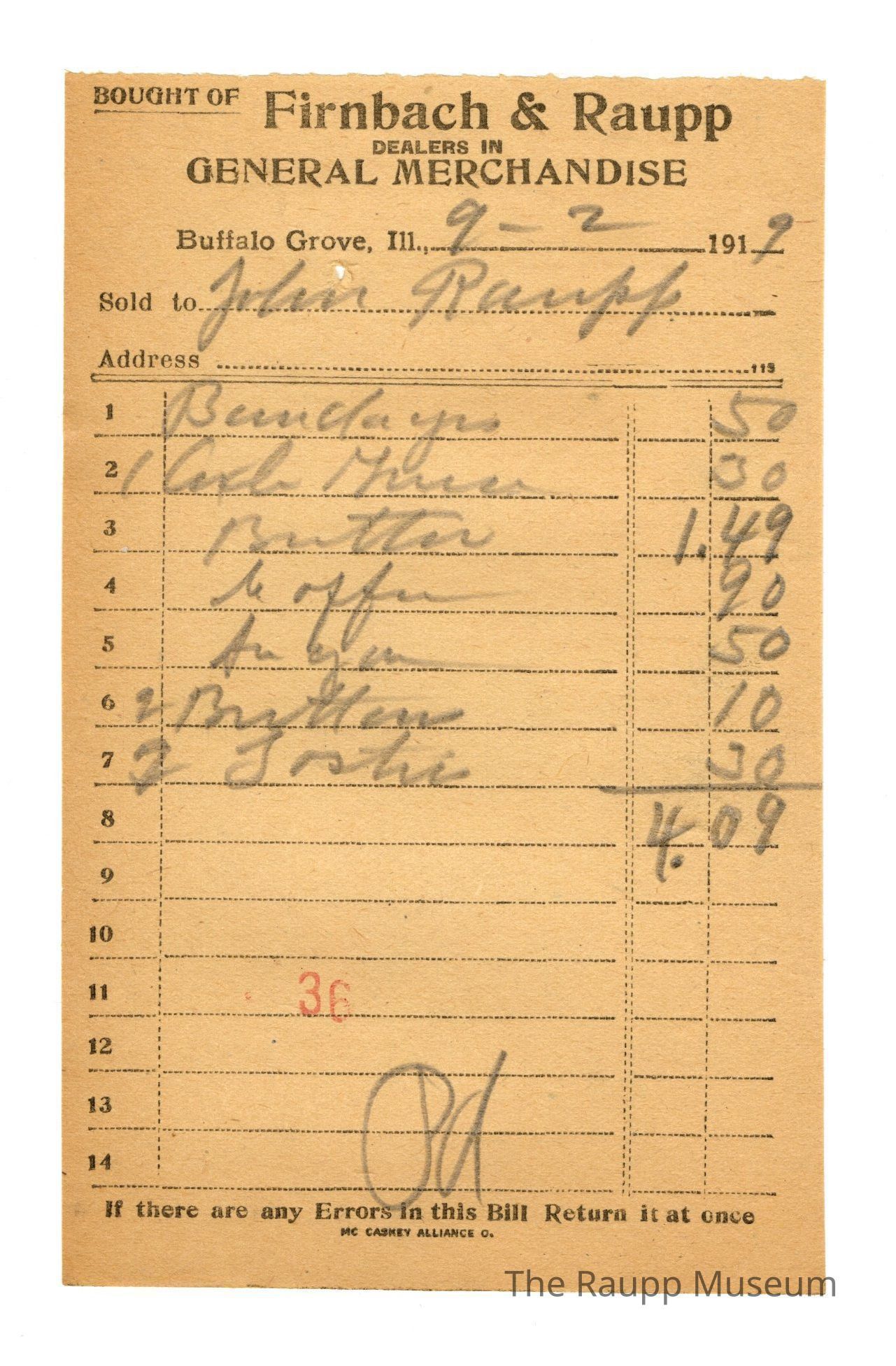 One (1) Firnbach and Raupp store receipt from September 02, 1919. Receipt recipient is John Raupp and has seven (7) items purchased (one (1) bandages, one (1) axl grease, one (1) butter, one (1) coffee, one (1) sugar, two (2) butter, two (2) Toastie (possibly Post Toastie cereal). John Raupp paid eighty two cents ($0.82). Reciept is rectangular, with black printed ink, and written in pencil. The top reads: Bought of Firnbach & Raupp; DEALERS IN GENERAL MERHCANDISE (printed in capital letters); Buffalo Grove, Ill,: Sold to; Address. The bottom reads: If there are any Errors in this Bill Return it at once. The number thirty six (stamped 36) is stamped in red in the bottom middle of the page.Archive Details