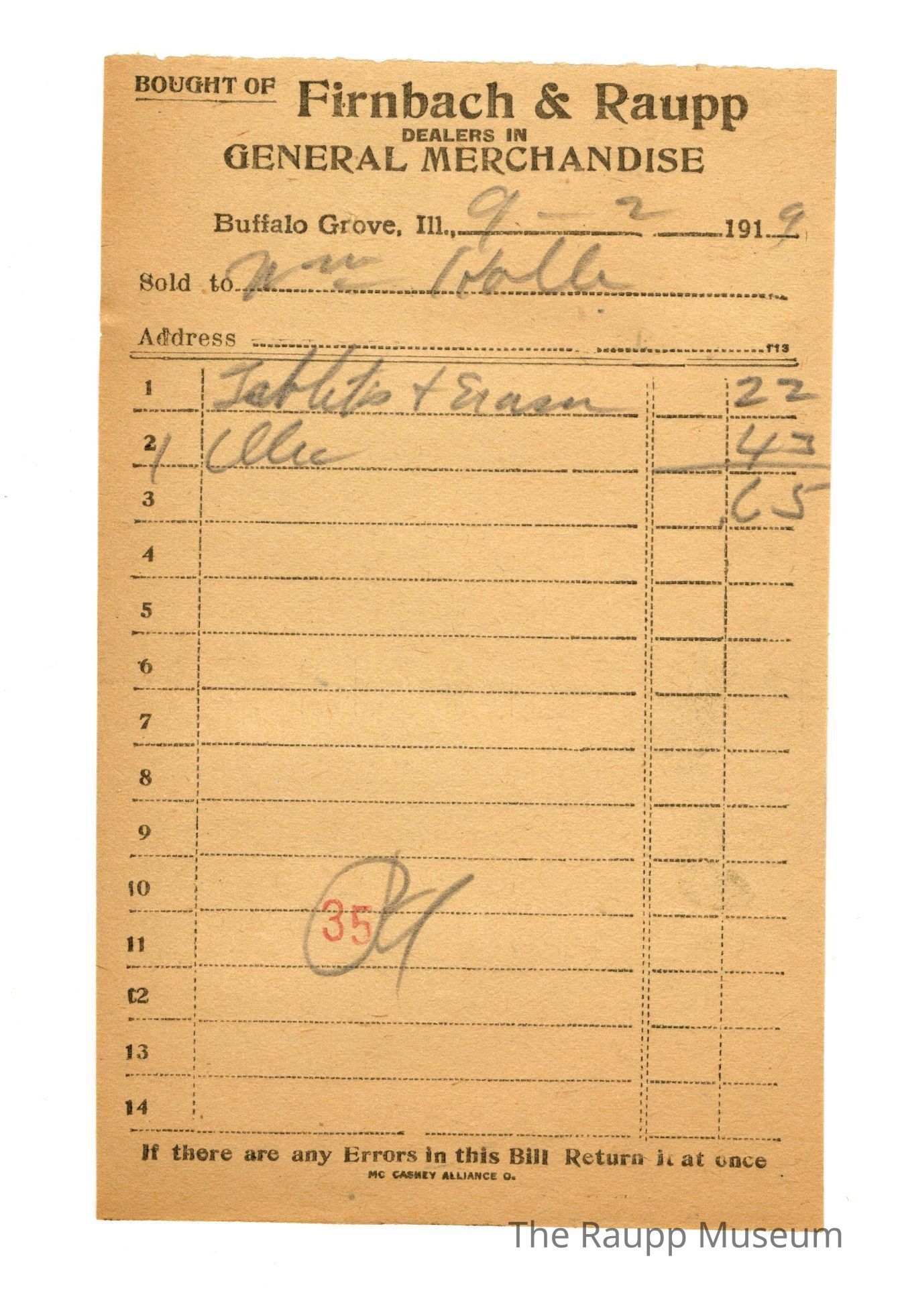 One (1) Firnbach and Raupp store receipt from September 02, 1919. Receipt recipient is for William (spelled Wm. on receipt) R. has two (2) items purchased (one (1) Tablets + Eraser and one (1) olio (early term for margarin). Wm. R. paid sixty five cents ($0.65). Receipt is rectangular, with black printed ink, and written in pencil. The top reads: Bought of Firnbach & Raupp; DEALERS IN GENERAL MERCHANDISE (printed in capital letters); Buffalo Grove, Ill,: Sold to; Address. The bottom reads: If there are any Errors in this Bill Return it at once. The number thirty five (stamped 35) is stamped in red in the bottom middle of the page.Archive Details