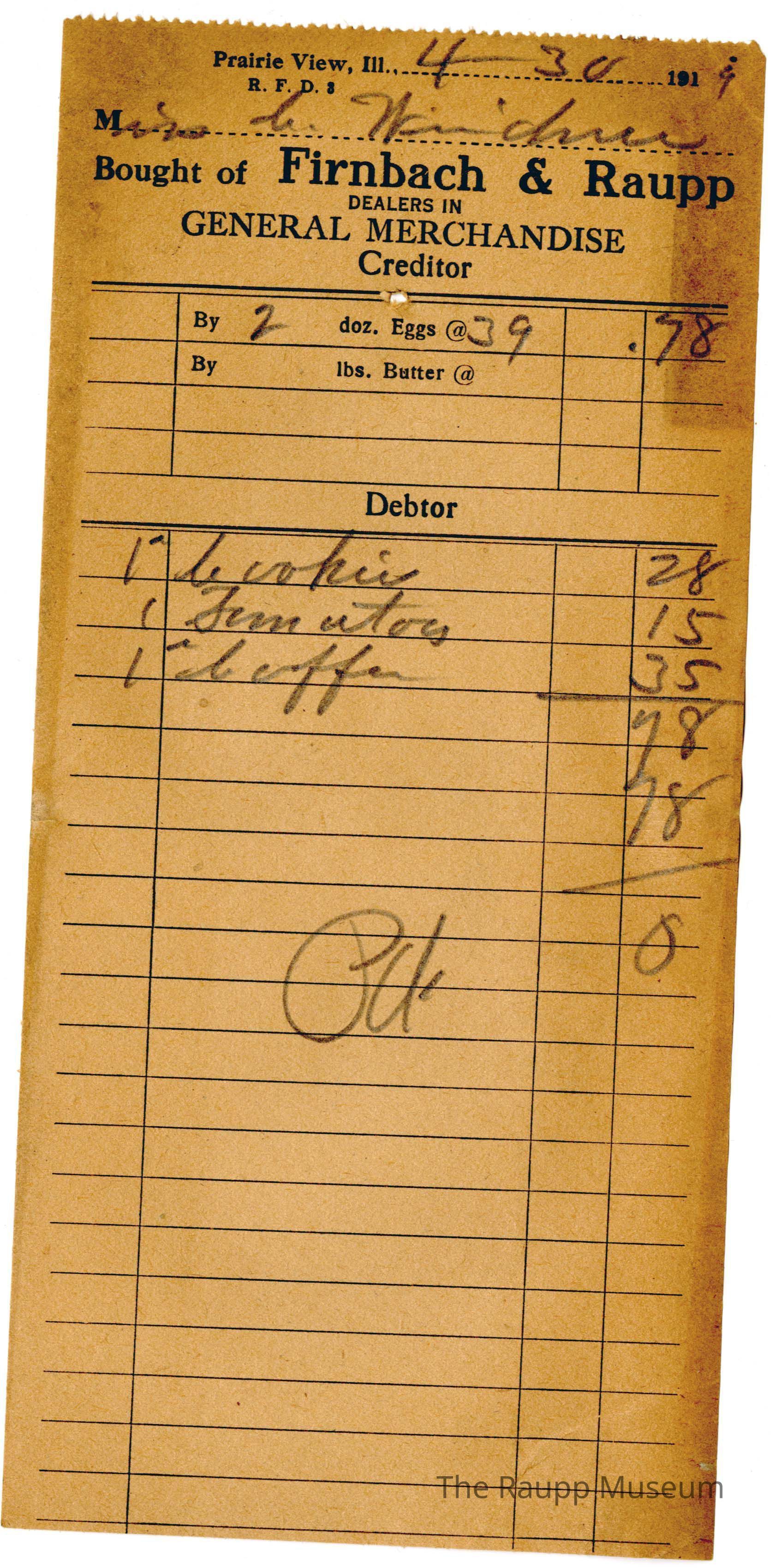 One (1) Firnbach and Raupp store receipt from April 30th, 1919. Receipt is for Mrs. Weidner, and has 3 items purchased totaling $0.78, and includes credit from 2 dozen eggs at $0.78. Receipt is rectangular, with black printed text, and written text in pencil.Archive Details