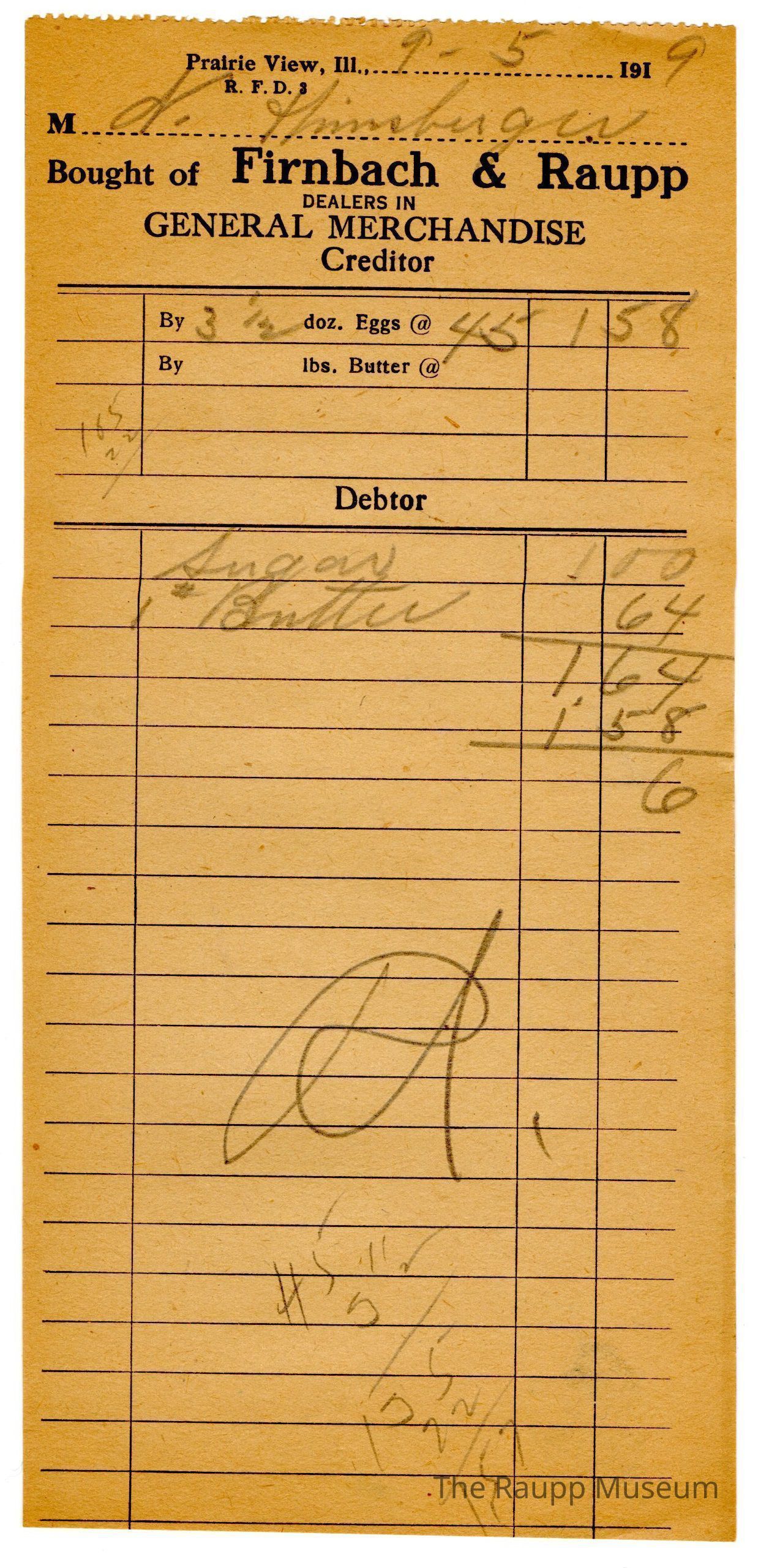 One (1) Firnbach and Raupp store receipt from September 04, 1919. Receipt recipient is N. Hinsburger and has two (2) items purchased (one (1) sugar and one (1) pound (written as a superscripted pound symbol) Butter). N. Hinsberger's bill was one dollar and sixty four cents ($1.64), however, N. Hinsberger brought in three and one half (3/2) dozen eggs for for five cents each, earing a credit of one dollar and fifty eight cents ($1.58). N. Hinsberger paid six cents ($0.06). Receipt is rectangular, has black ink and written in pencil. The top reads: Prairie View, Ill; Bought of Firnbach & Raupp; DEALERS IN; GENERAL MERCHANDISE (printed in capital letters); Creditor, Debtor.Archive Details