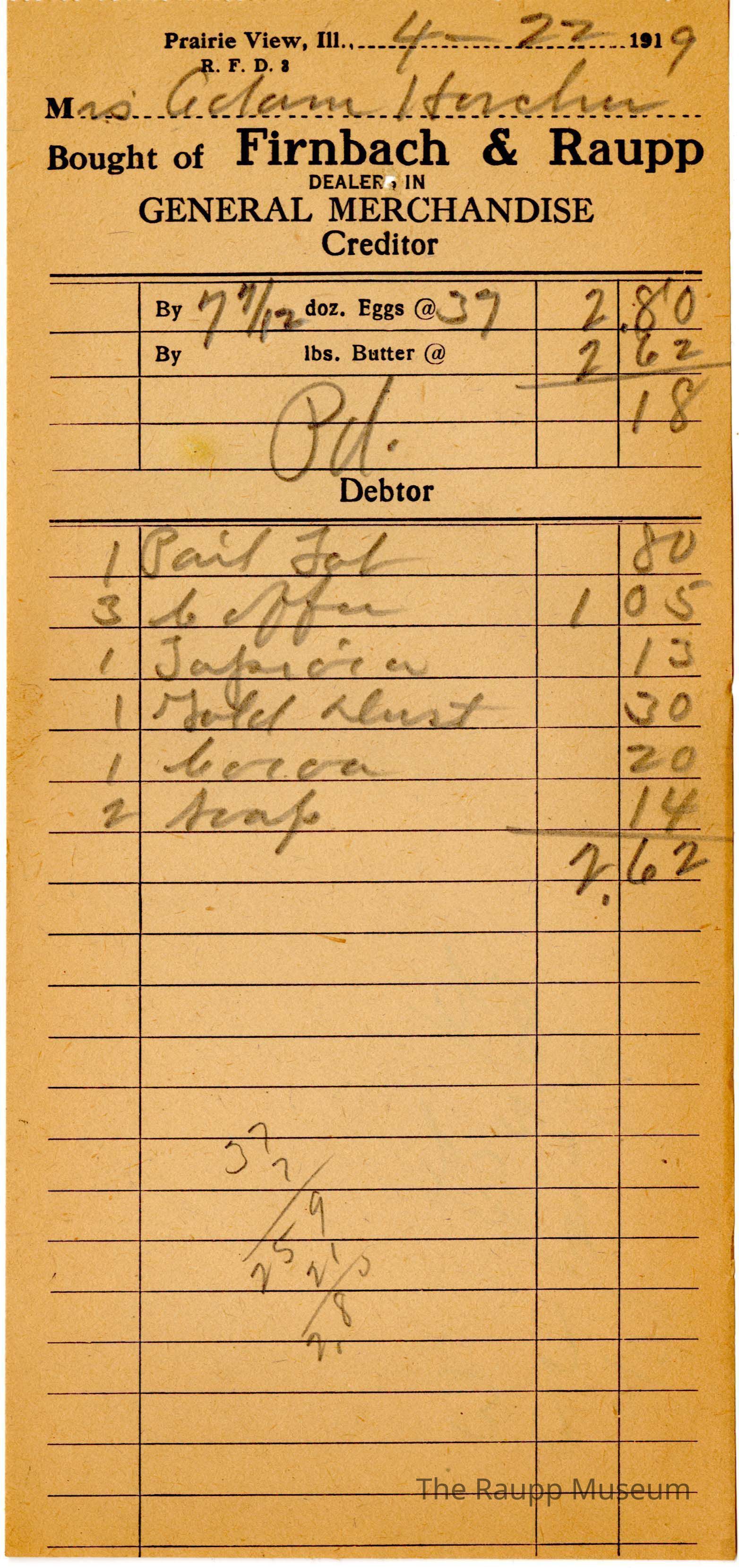 One (1) Firnbach and Raupp store receipt from April 22nd, 1919. Receipt is for Mrs. Adam Horcher, and has 6 items purchased with credit from 7 and 7/12 dozen eggs. Bill total $2.62, credit total $2.80. Receipt is rectangular, with black printed text, and written text in pencil.Archive Details