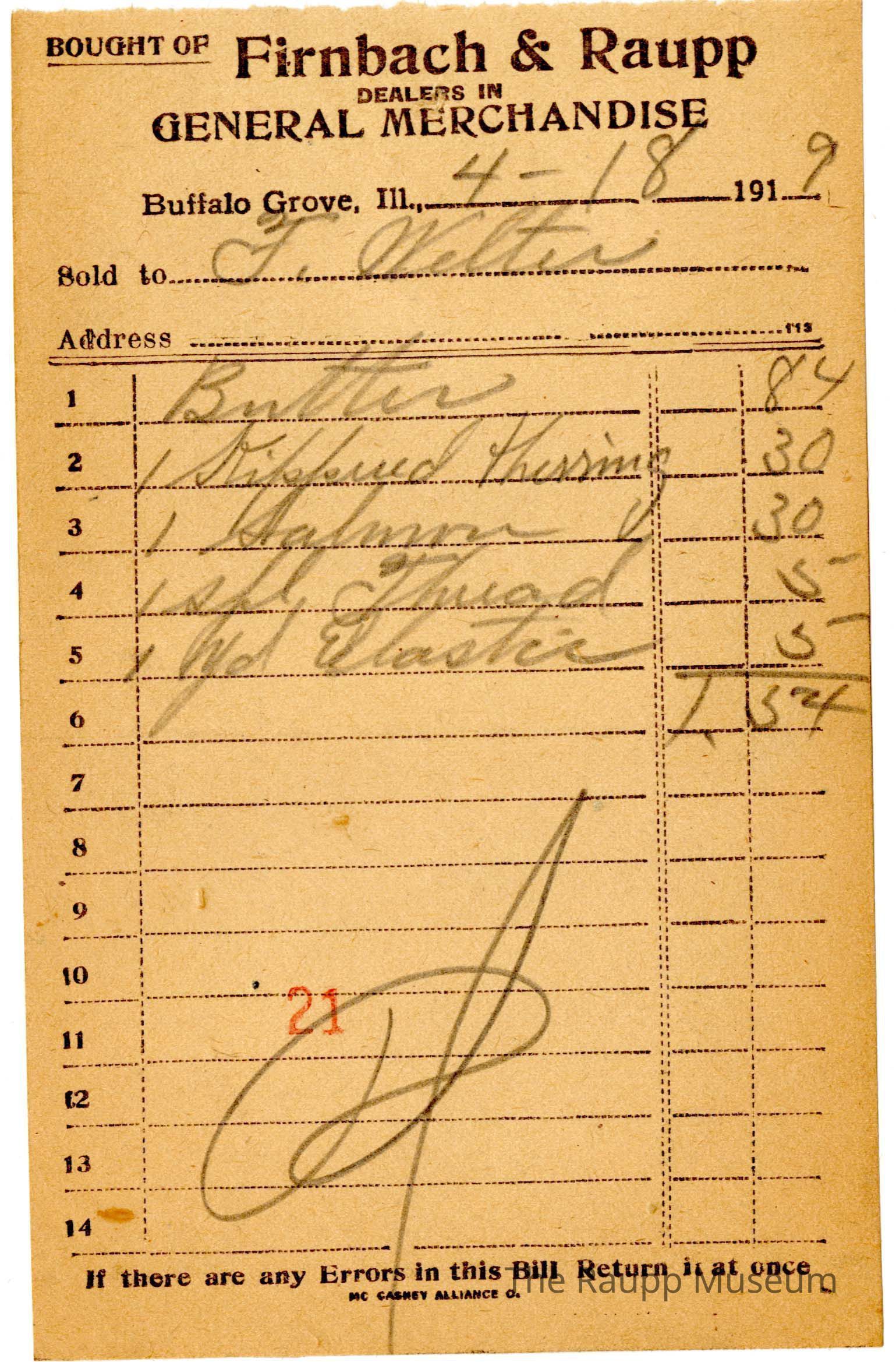 One (1) Firnbach and Raupp store receipt from April 18, 1919. Receipt is for F. Welter, and has 5 items purchased. Bill total $1.54. Receipt is rectangular, with black printed text, and written text in pencil.Archive Details