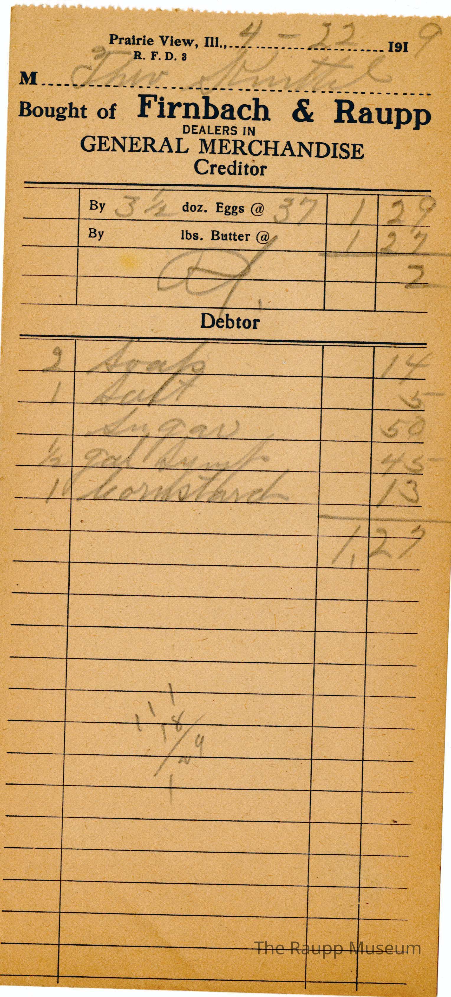 One (1) Firnbach and Raupp store receipt from April 22nd, 1919. Receipt is for Theo Shnittel (?), and includes credit for 3.5 dozen eggs, and 5 items purchased totaling $1.27. Receipt is rectangular, with black printed text, and written text in pencil.Archive Details