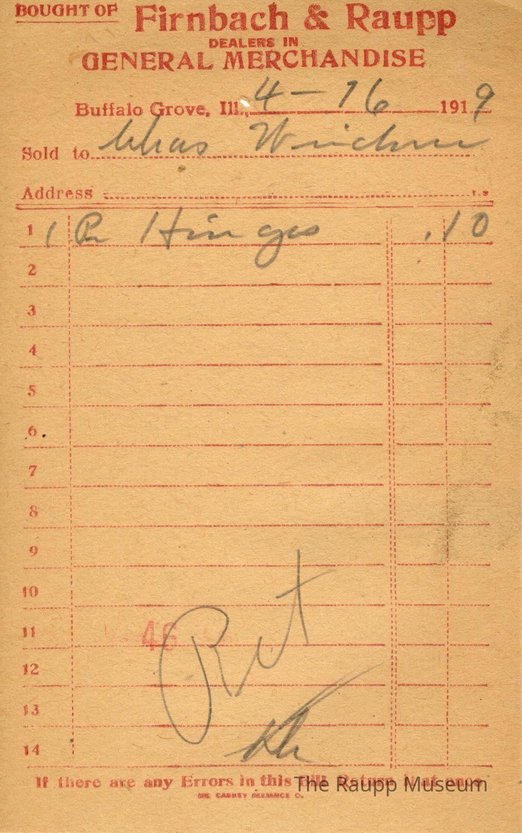 One (1) Firnbach and Raupp store receipt from April 16, 1919. Receipt is rectangular with red printed text and written notes in pencil. This receipt is for Wlias (?) Weidner, who purchased one pair of hinges for ten cents. Bill total is $0.10. There's a red stamp of 46 close to the bottom, with the bill marked as either "Rct" or "Pd", meaning "received" or "paid".