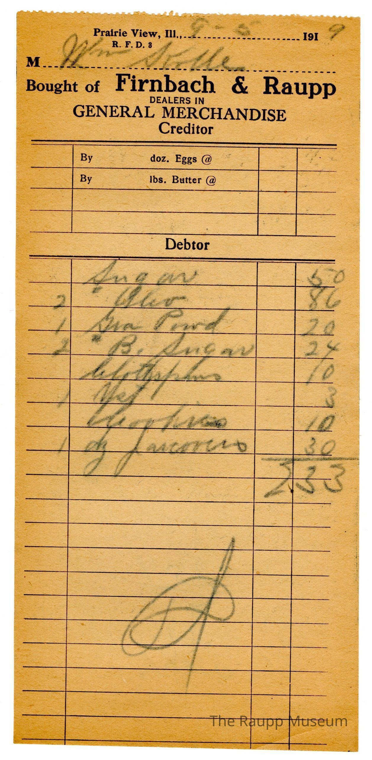 One (1) Firnbach and Raupp store receipt from September 05, 1919. Receipt recipient is William (written as Wm. on the receipt) S. and has eight (8) items purchased (one (1) sugar, two (2) pounds (written as a superscripted pound symbol) olio, one (1) unknown powder, two (2) pounds (written as a superscripted pound symbol) B. Sugar (brown sugar), one (1) yeast (written as Yst), one (1) unknown item, and one (1) dozen jarcovers).Wm. S. paid two dollars and thrity three cents ($2.33), Receipt is rectangular, has black ink and written blue pen. The top reads: Prairie View, Ill; Bought of Firnbach & Raupp; DEALERS IN; GENERAL MERCHANDISE (printed in capital letters); Creditor, Debtor. There is an addition equation on the back of the receipt.Archive Details
