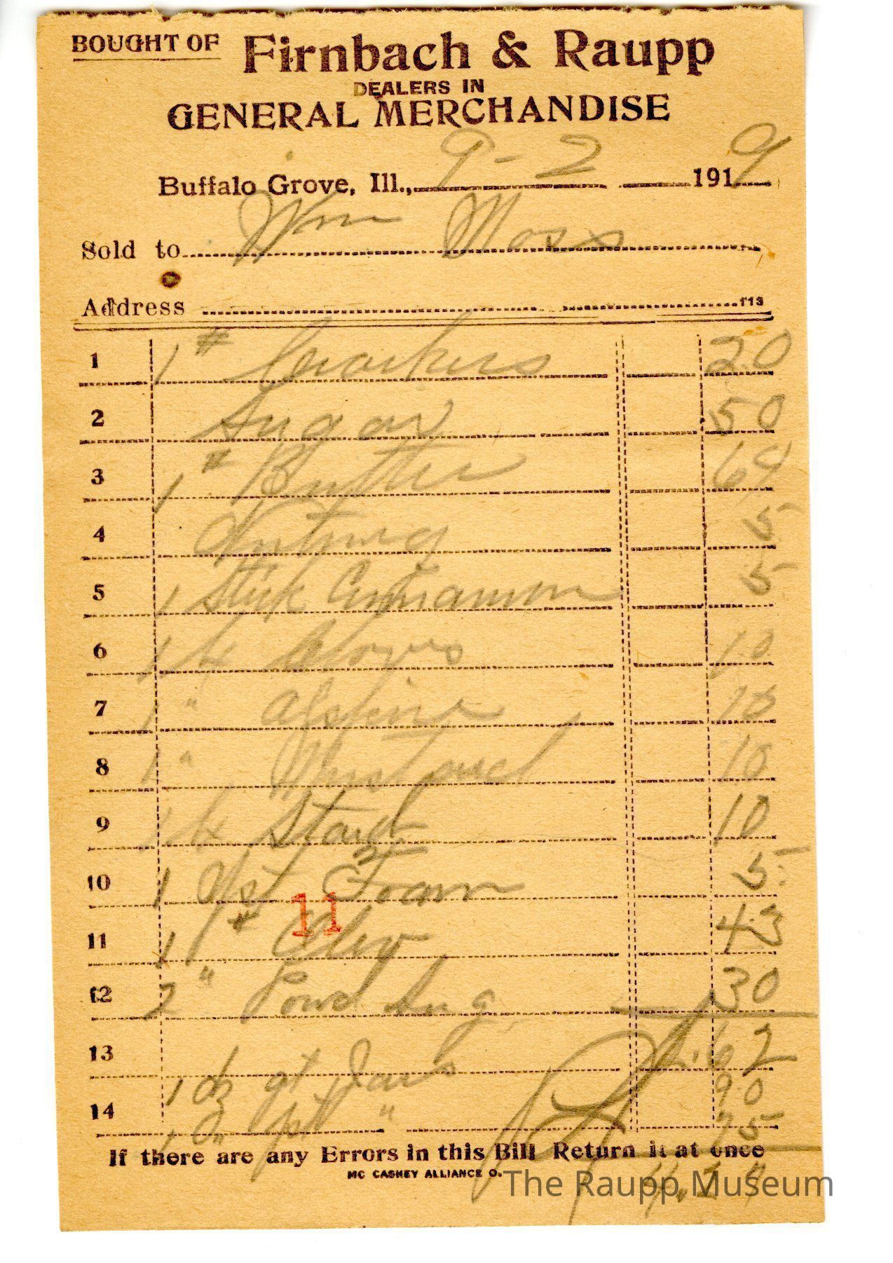 One (1) Firnbach and Raupp store receipt from September 02, 1919. Receipt recipient is William (written Wm. on the receipt), and has fourteen (14) items purchased (one (1) pound (written as a superscripted pound sign) crackers, one (1) sugar, one (1) pound (written as a superscripted pound sign) butter, one (1) unknown item, one (1) stick cinamon, one (1) 1/4 cloves , one (1) unknown item, one fourth (1/4) starch, one (1) yeast (written as Yst) Foam, one (1) one (1) pound (written as a superscripted pound sign) Olio, two (2) powder sugar (written as Powd Sug), one (1) dozen (12) quart jars and one (1) dozen (12) pint (written as pint jars). Wm. Moos paid a total of four dollars and twenty seven cents ($4.27). Receipt is rectangular, with black printed ink, and written in pencil. The top reads: BOUGHT OF (printed in capital letters and underlined) Firnbach & Raupp; DEALERS IN GENERAL MERCHANDISE (printed in capital letters); Buffalo Grove Ill,.: Sold to; Address. The bottom: If there are any Errors in this Rill Return it at once. The number eleven (stamped as 11) is stamped in red near the bottom center of the reciept.Archive Details